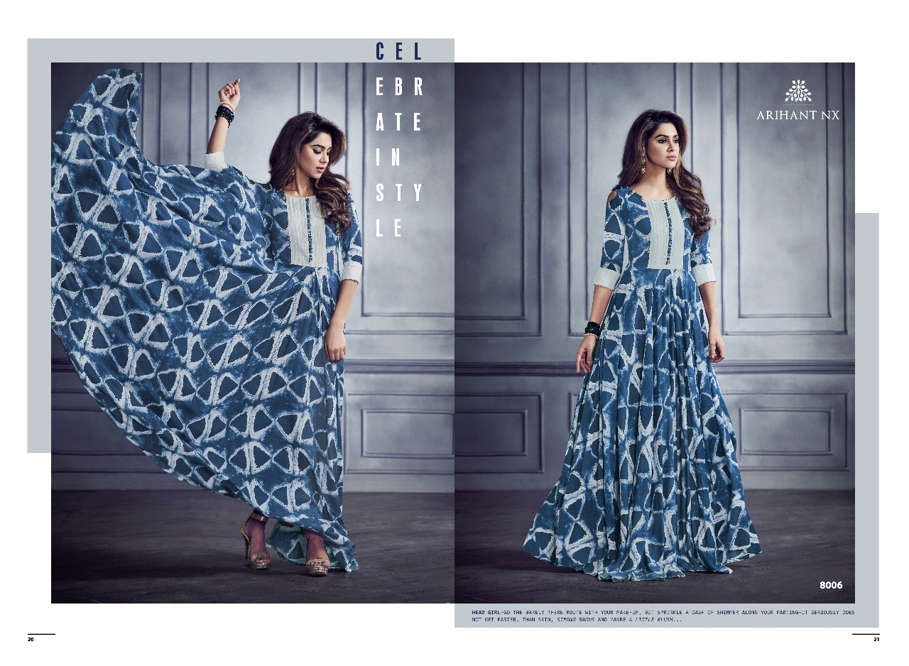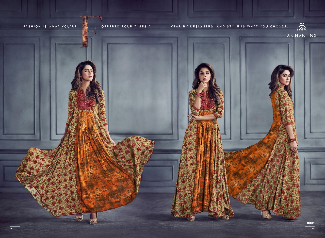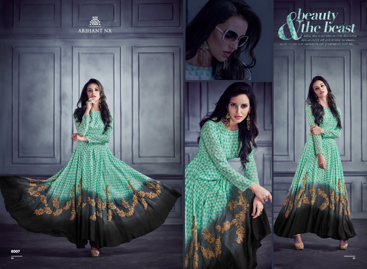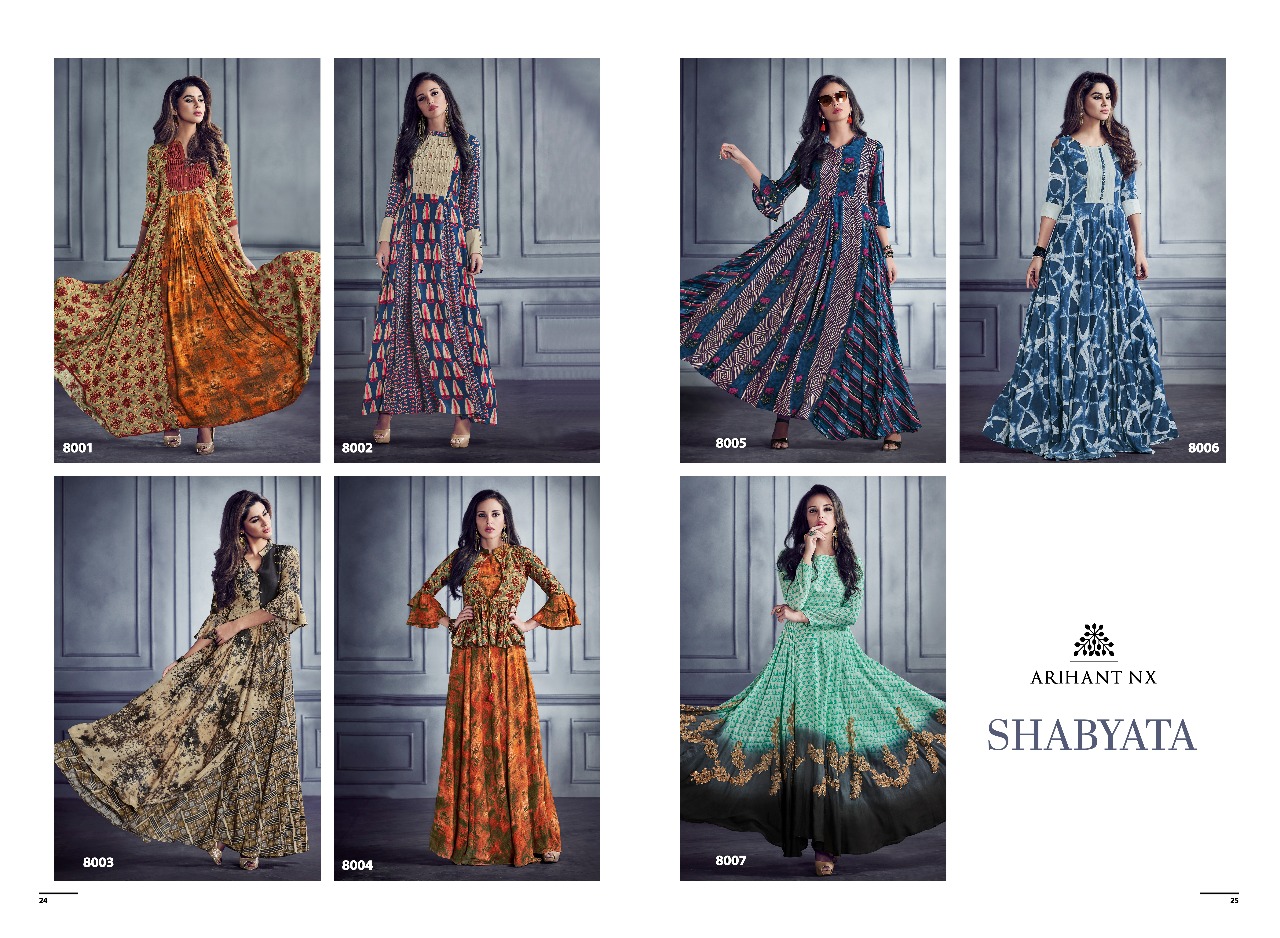 Buy Online Shabyata By Arihant Nx Series 8001 To 8007 Heavy Reyon Gown Wholesale Supplier And Dealer Gujarat 7 Pcs of Full Catalogue at Wholesale Price. Looking for Shabyata By Arihant Nx Series 8001 To 8007 Heavy Reyon Gown Wholesale Supplier And Dealer Gujarat Full Catalouge at Best Price? Buy Now Shabyata By Arihant Nx Series 8001 To 8007 Heavy Reyon Gown Wholesale Supplier And Dealer Gujarat at Wholesale Rate of Rs 5593 with Total 7 Pcs from authroized dealer and supplier of ARIHANT NX Brand. Cost of Each piece is just only Rs 799 which is very low and affordable price to resale the product in your retail store ,This is Surat based Wholesale Supplier & Dealer of ARIHANT NX Brand. Click on Brand name to Know more about ARIHANT NX Brand's products.Call or Whatsapp on 9898838984 for booking or enquiry