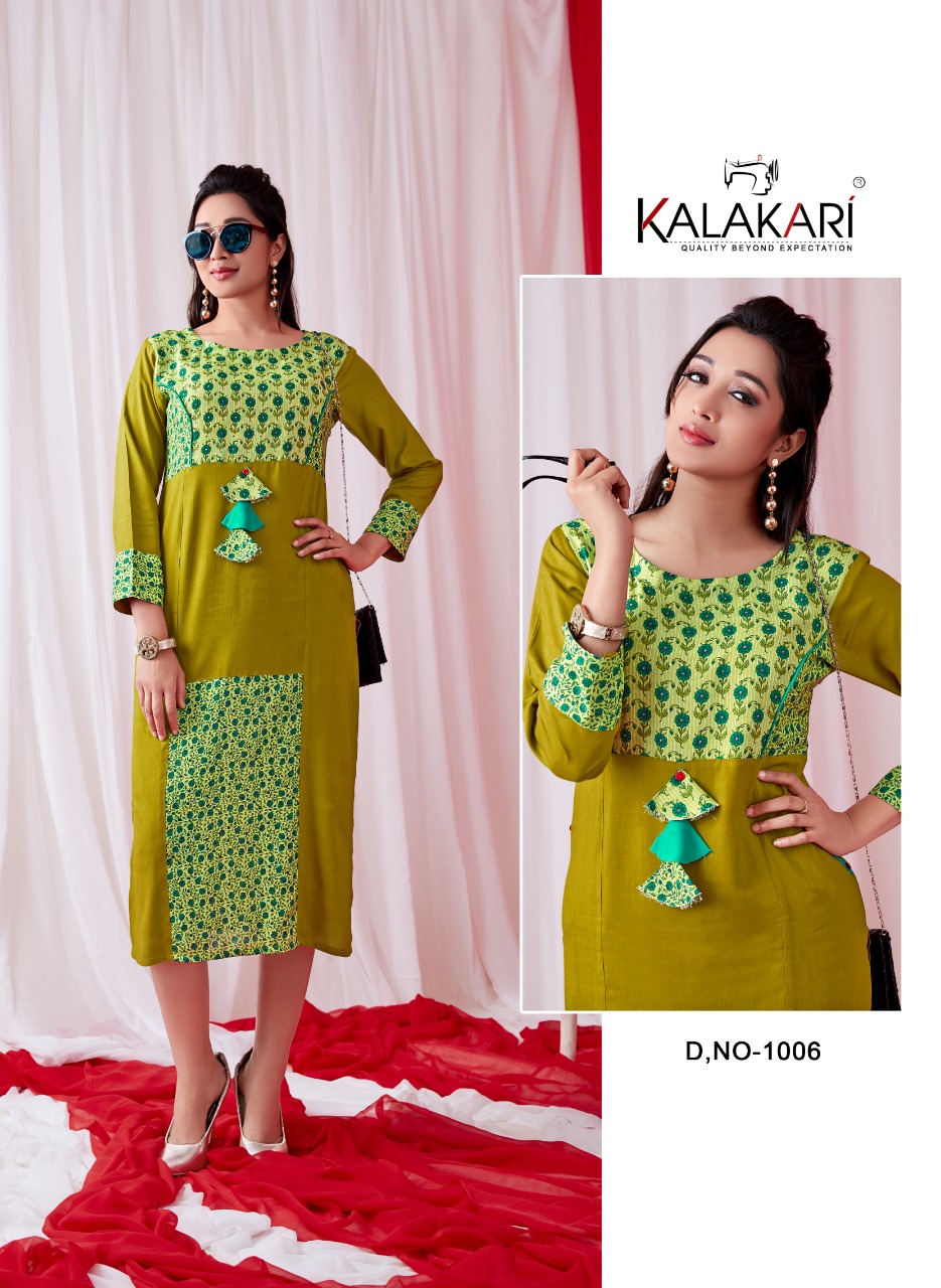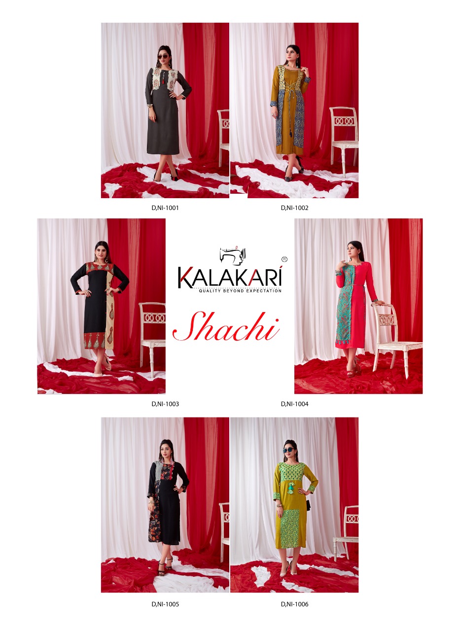 Buy Online Shachi Vol 4 By Kalakari Nx 1001 Series Designer Reyon Printed Kurti Catlog Wholesale Dealer Surat 6 Pcs of Full Catalogue at Wholesale Price. Looking for Shachi Vol 4 By Kalakari Nx 1001 Series Designer Reyon Printed Kurti Catlog Wholesale Dealer Surat Full Catalouge at Best Price? Buy Now Shachi Vol 4 By Kalakari Nx 1001 Series Designer Reyon Printed Kurti Catlog Wholesale Dealer Surat at Wholesale Rate of Rs 2694 with Total 6 Pcs from authroized dealer and supplier of KALAKARI NX Brand. Cost of Each piece is just only Rs 449 which is very low and affordable price to resale the product in your retail store ,This is Surat based Wholesale Supplier & Dealer of KALAKARI NX Brand. Click on Brand name to Know more about KALAKARI NX Brand's products.Call or Whatsapp on 9898838984 for booking or enquiry