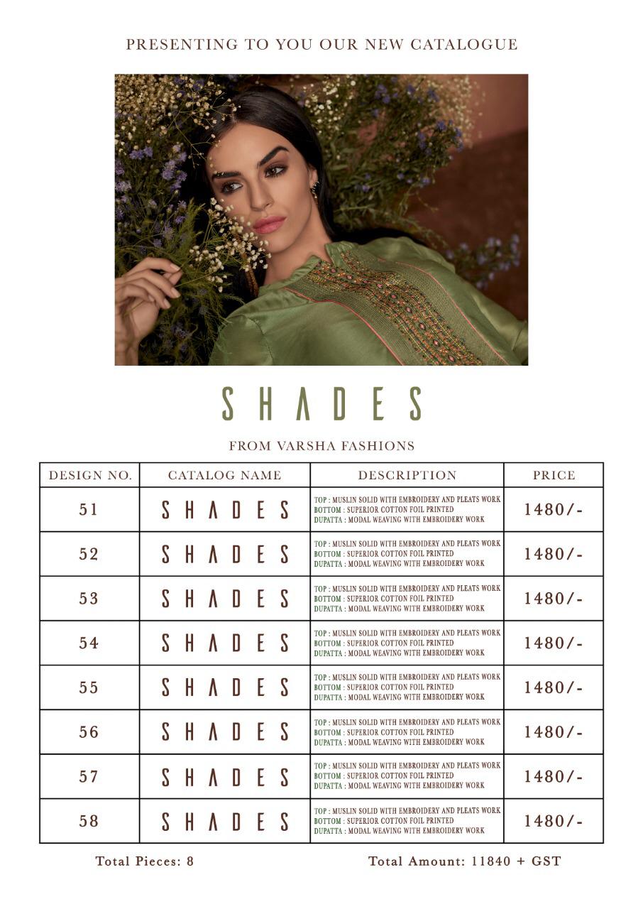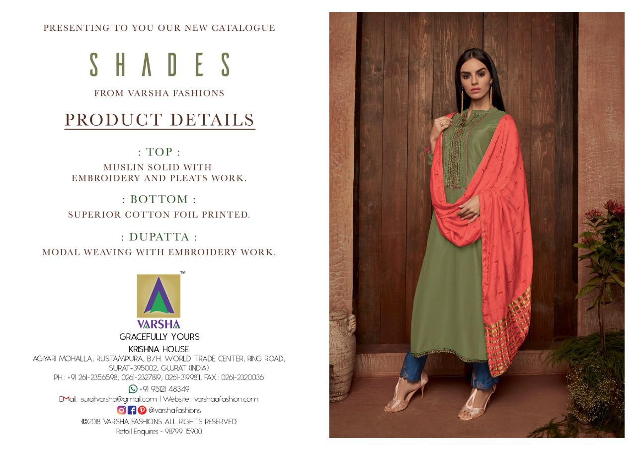 Buy Online Shades By Varsha 51 Series Fancy Muslin Solid Salwar Kameez Catlog Wholesaler Surat 8 Pcs of Full Catalogue at Wholesale Price. Looking for Shades By Varsha 51 Series Fancy Muslin Solid Salwar Kameez Catlog Wholesaler Surat Full Catalouge at Best Price? Buy Now Shades By Varsha 51 Series Fancy Muslin Solid Salwar Kameez Catlog Wholesaler Surat at Wholesale Rate of Rs 11840 with Total 8 Pcs from authroized dealer and supplier of Brand. Cost of Each piece is just only Rs 1480 which is very low and affordable price to resale the product in your retail store ,This is Surat based Wholesale Supplier & Dealer of Brand. Click on Brand name to Know more about Brand's products.Call or Whatsapp on 9898838984 for booking or enquiry