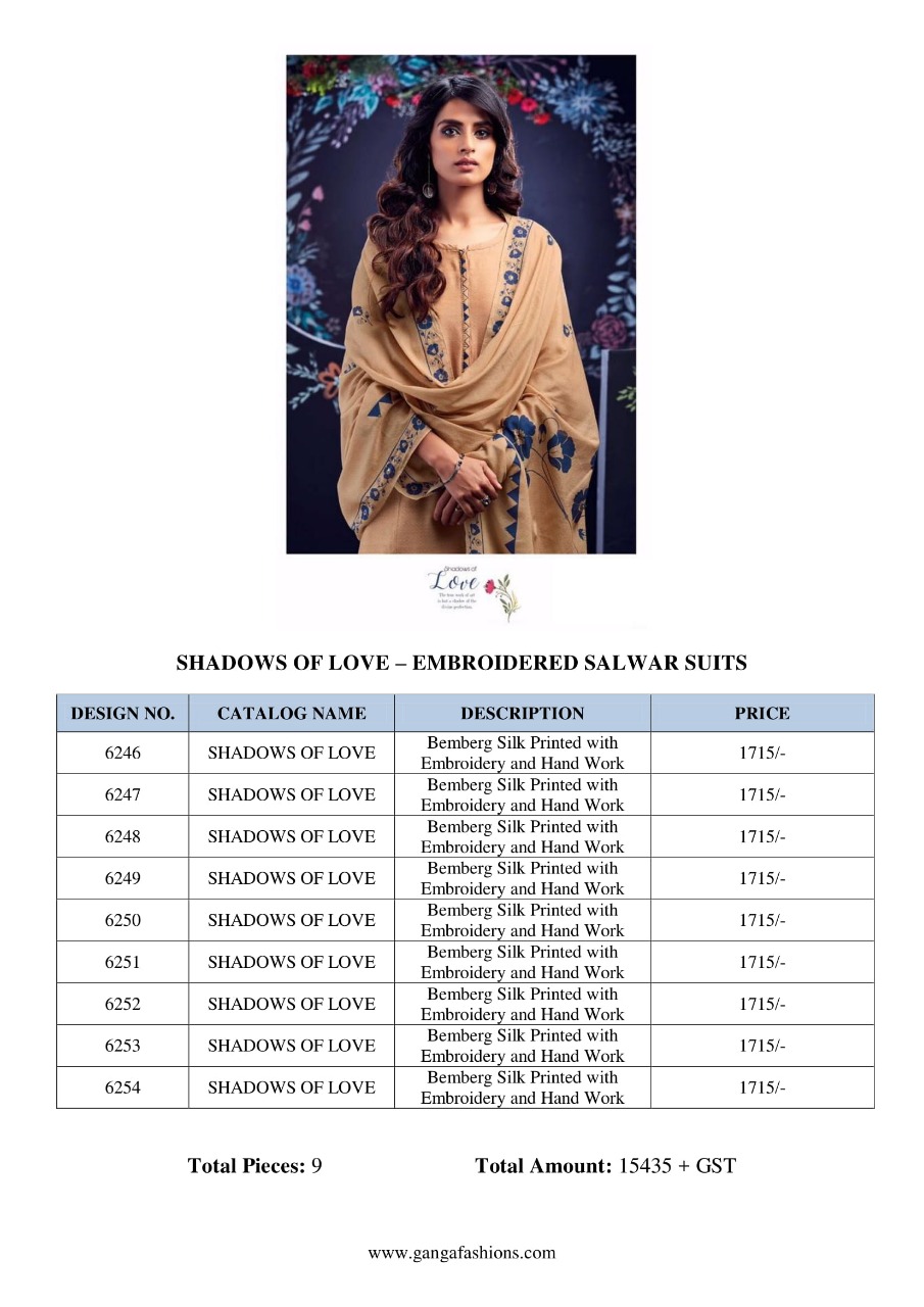 Buy Online Shadows Of Love By Ganga Silk Embroidered Designer Party Wear Dresses Wholesale Supplier And Dealer Surat 9 Pcs of Full Catalogue at Wholesale Price. Looking for Shadows Of Love By Ganga Silk Embroidered Designer Party Wear Dresses Wholesale Supplier And Dealer Surat Full Catalouge at Best Price? Buy Now Shadows Of Love By Ganga Silk Embroidered Designer Party Wear Dresses Wholesale Supplier And Dealer Surat at Wholesale Rate of Rs 15435 with Total 9 Pcs from authroized dealer and supplier of GANGA Brand. Cost of Each piece is just only Rs 1715 which is very low and affordable price to resale the product in your retail store ,This is Surat based Wholesale Supplier & Dealer of GANGA Brand. Click on Brand name to Know more about GANGA Brand's products.Call or Whatsapp on 9898838984 for booking or enquiry