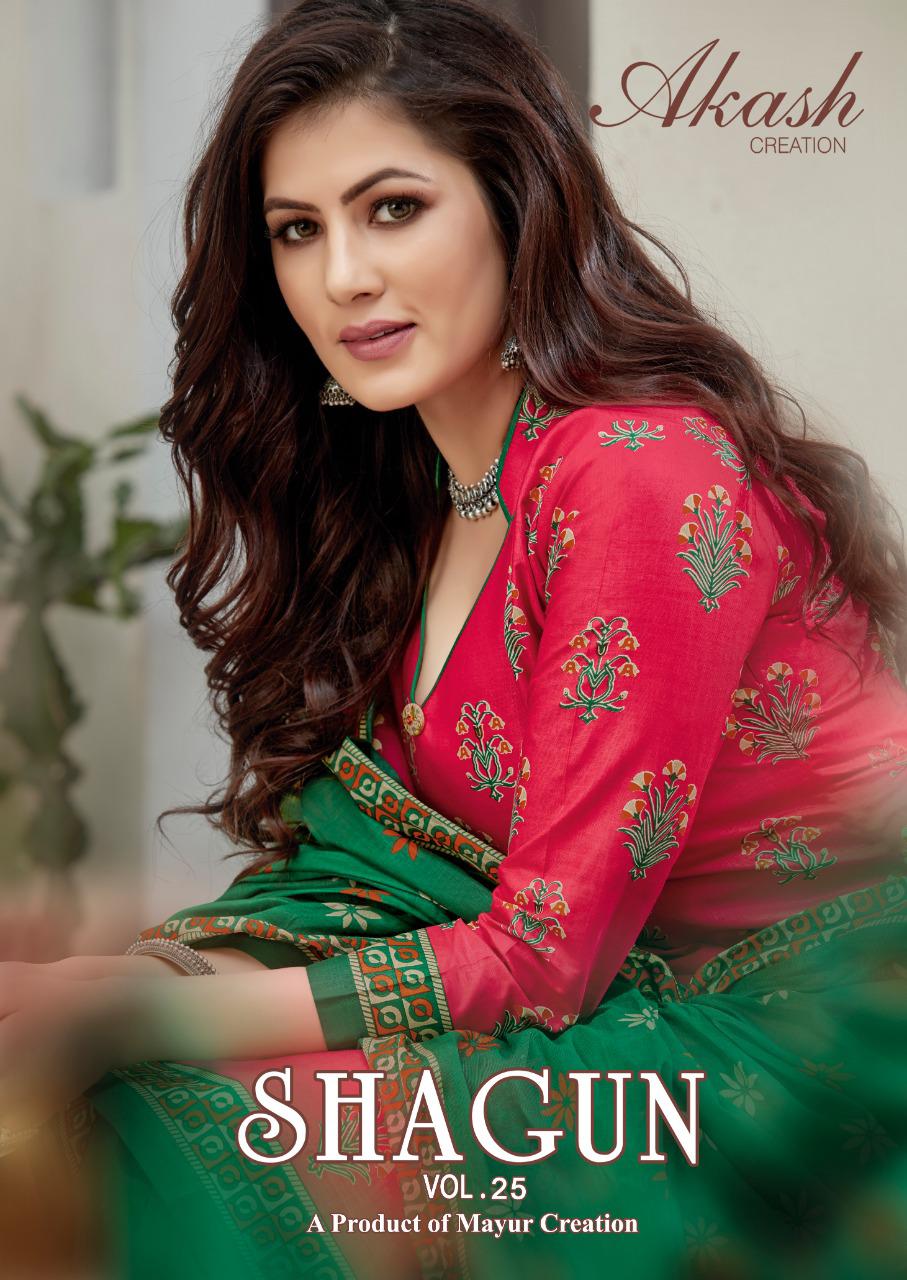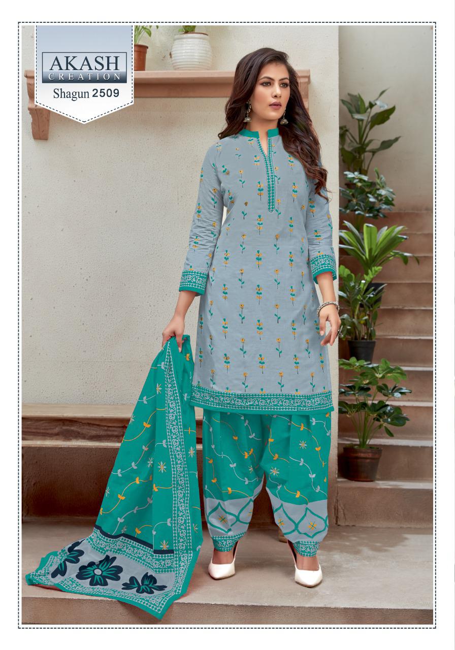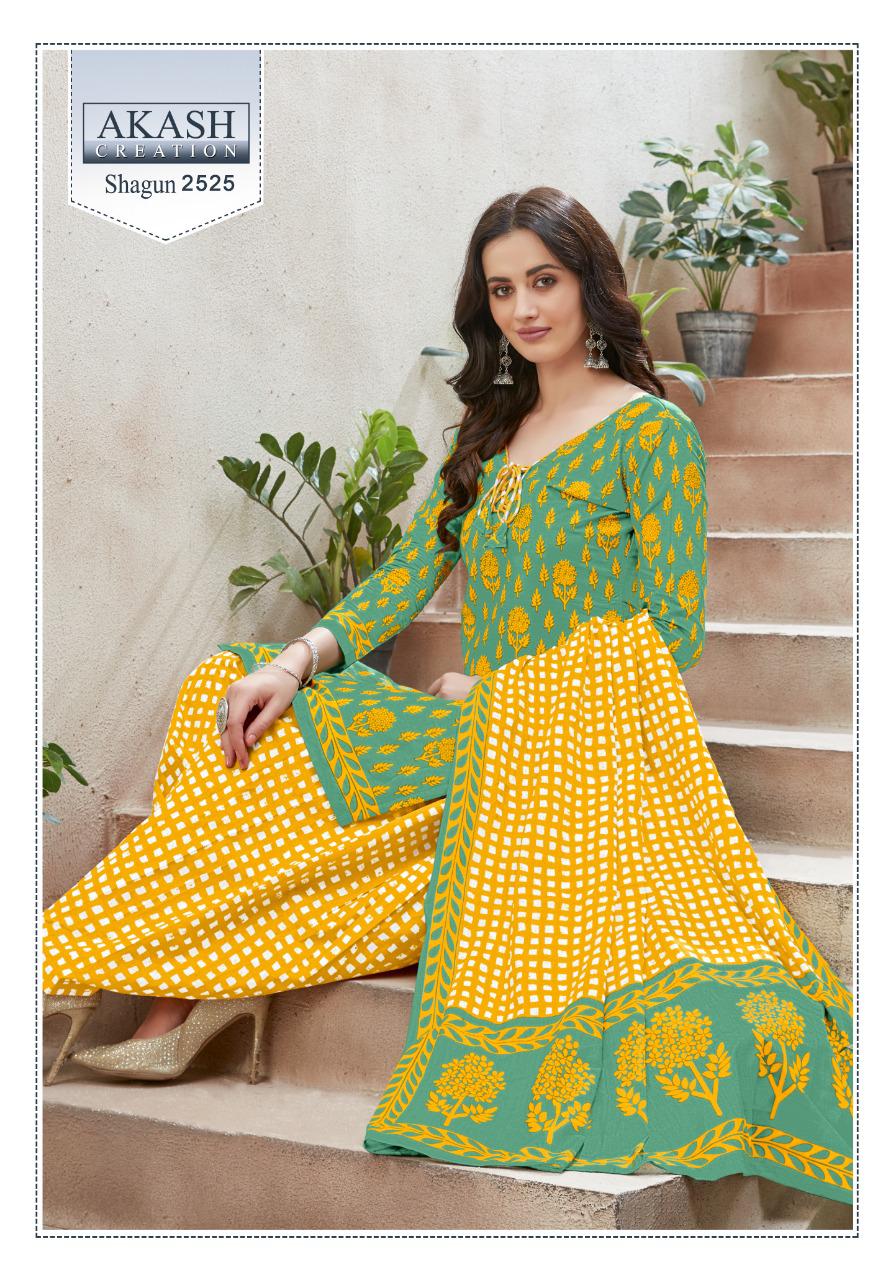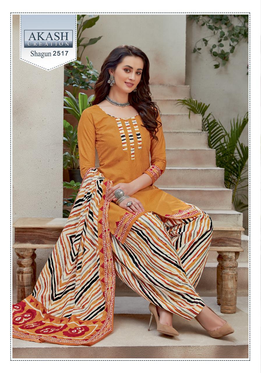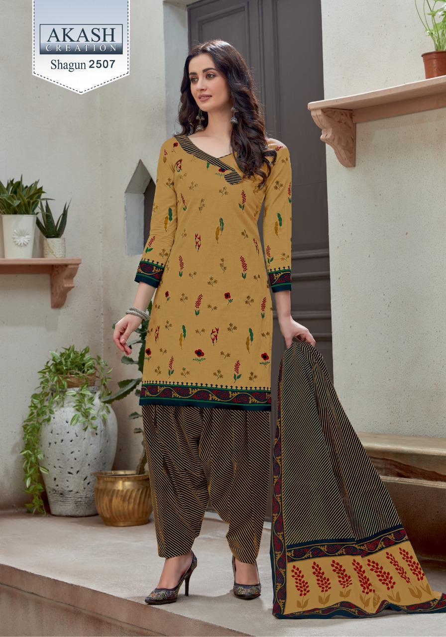 Buy Online Shagun 25 By Akash Creation By Mayur Manufacturer Traders Surat Gujrat 25 Pcs of Full Catalogue at Wholesale Price. Looking for Shagun 25 By Akash Creation By Mayur Manufacturer Traders Surat Gujrat Full Catalouge at Best Price? Buy Now Shagun 25 By Akash Creation By Mayur Manufacturer Traders Surat Gujrat at Wholesale Rate of Rs 7625 with Total 25 Pcs from authroized dealer and supplier of Patiala Suit Brand. Cost of Each piece is just only Rs 305 which is very low and affordable price to resale the product in your retail store ,This is Surat based Wholesale Supplier & Dealer of Patiala Suit Brand. Click on Brand name to Know more about Patiala Suit Brand's products.Call or Whatsapp on 9898838984 for booking or enquiry