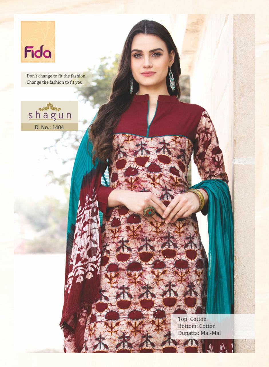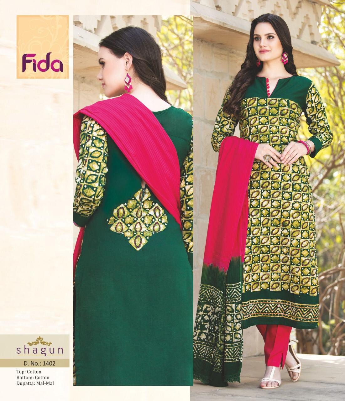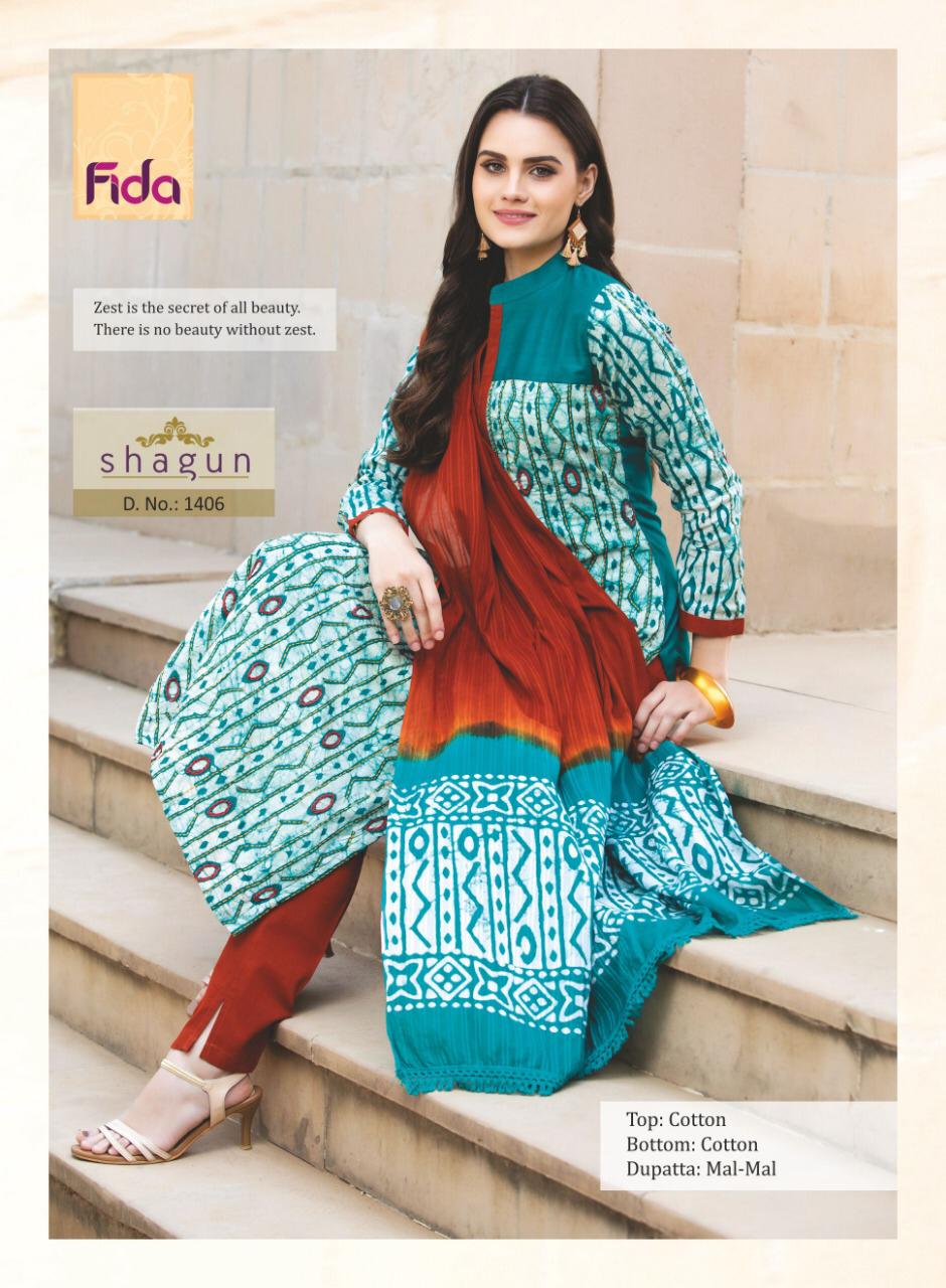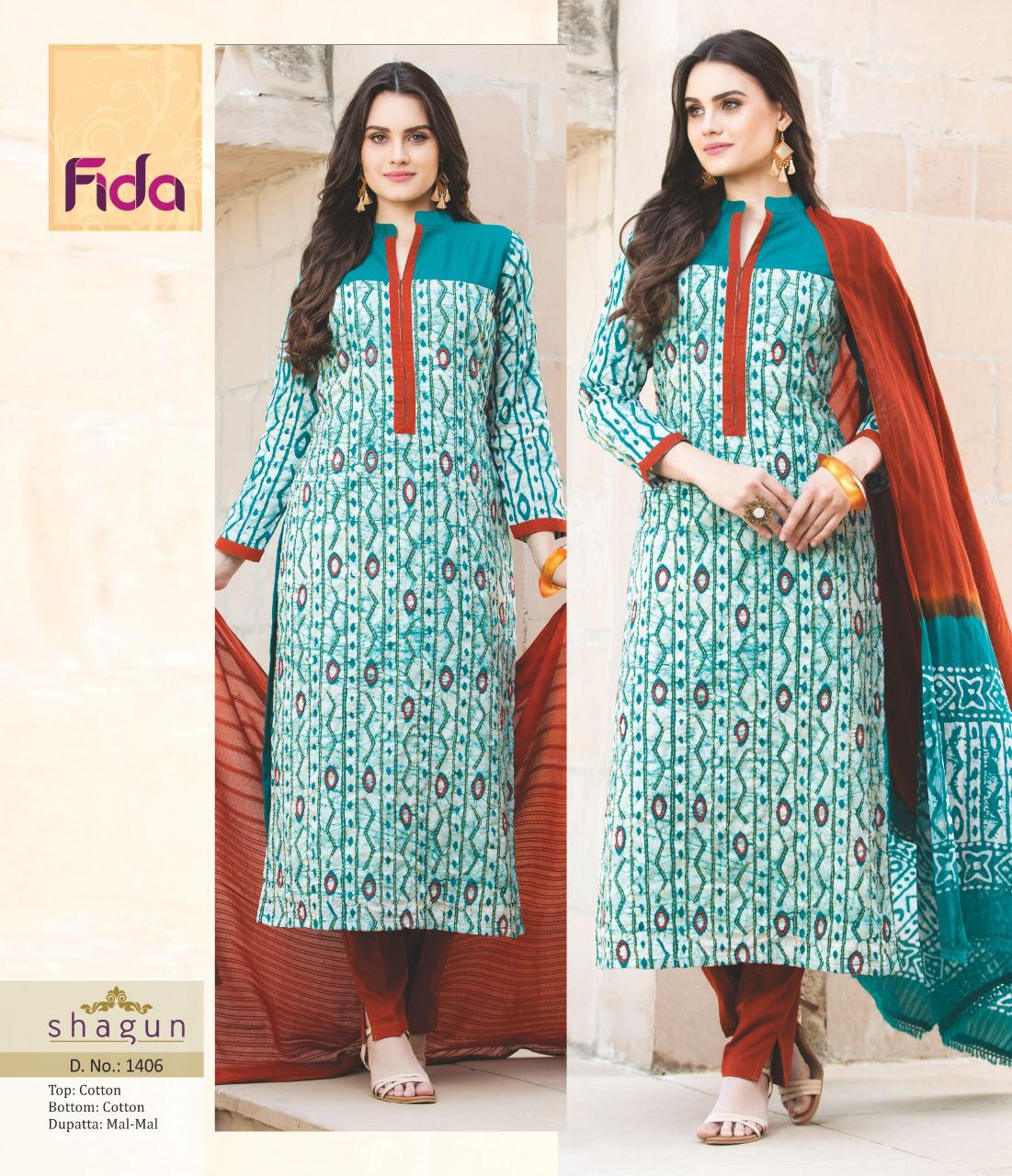 Buy Online Shagun By Fida 1401 Series Fancy Cotton Printed Salwar Kameez Catlog Wholesaler Surat 6 Pcs of Full Catalogue at Wholesale Price. Looking for Shagun By Fida 1401 Series Fancy Cotton Printed Salwar Kameez Catlog Wholesaler Surat Full Catalouge at Best Price? Buy Now Shagun By Fida 1401 Series Fancy Cotton Printed Salwar Kameez Catlog Wholesaler Surat at Wholesale Rate of Rs 5100 with Total 6 Pcs from authroized dealer and supplier of Brand. Cost of Each piece is just only Rs 850 which is very low and affordable price to resale the product in your retail store ,This is Surat based Wholesale Supplier & Dealer of Brand. Click on Brand name to Know more about Brand's products.Call or Whatsapp on 9898838984 for booking or enquiry
