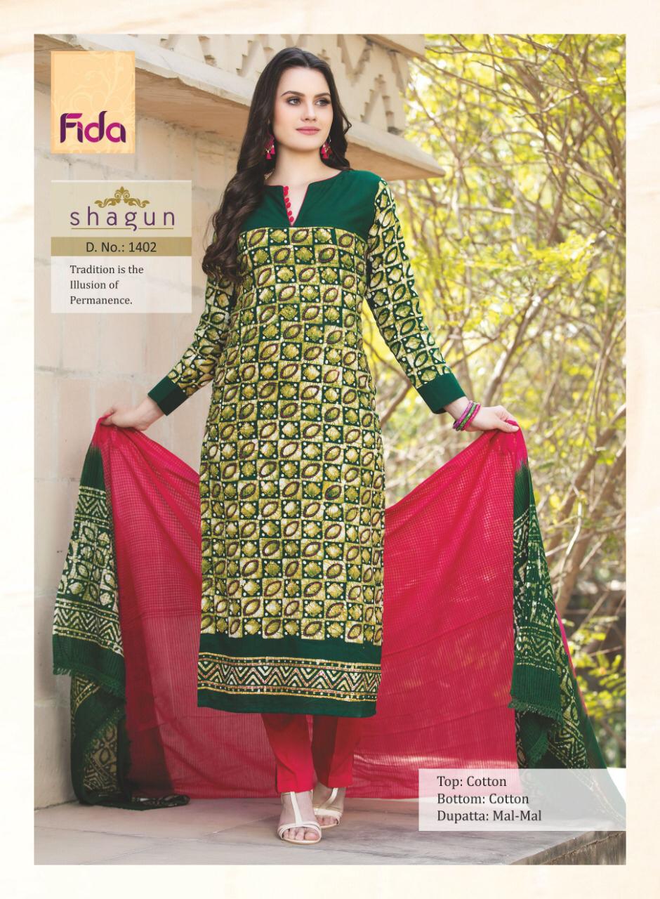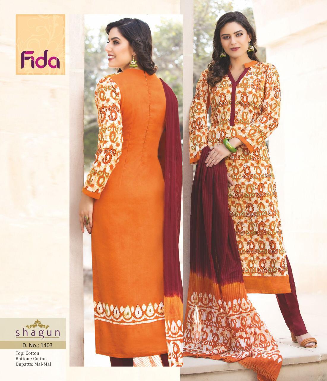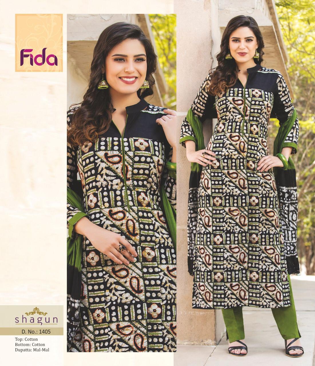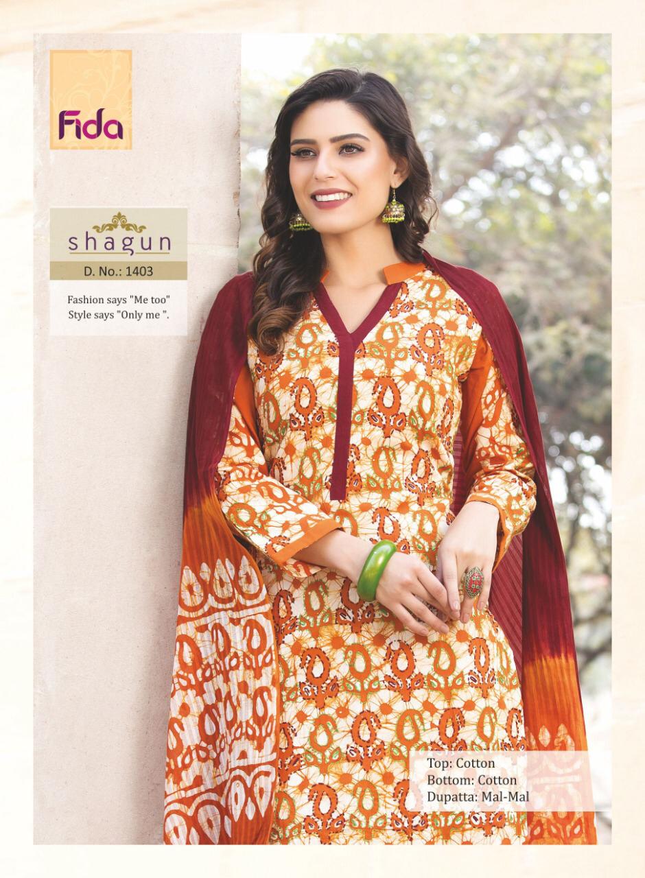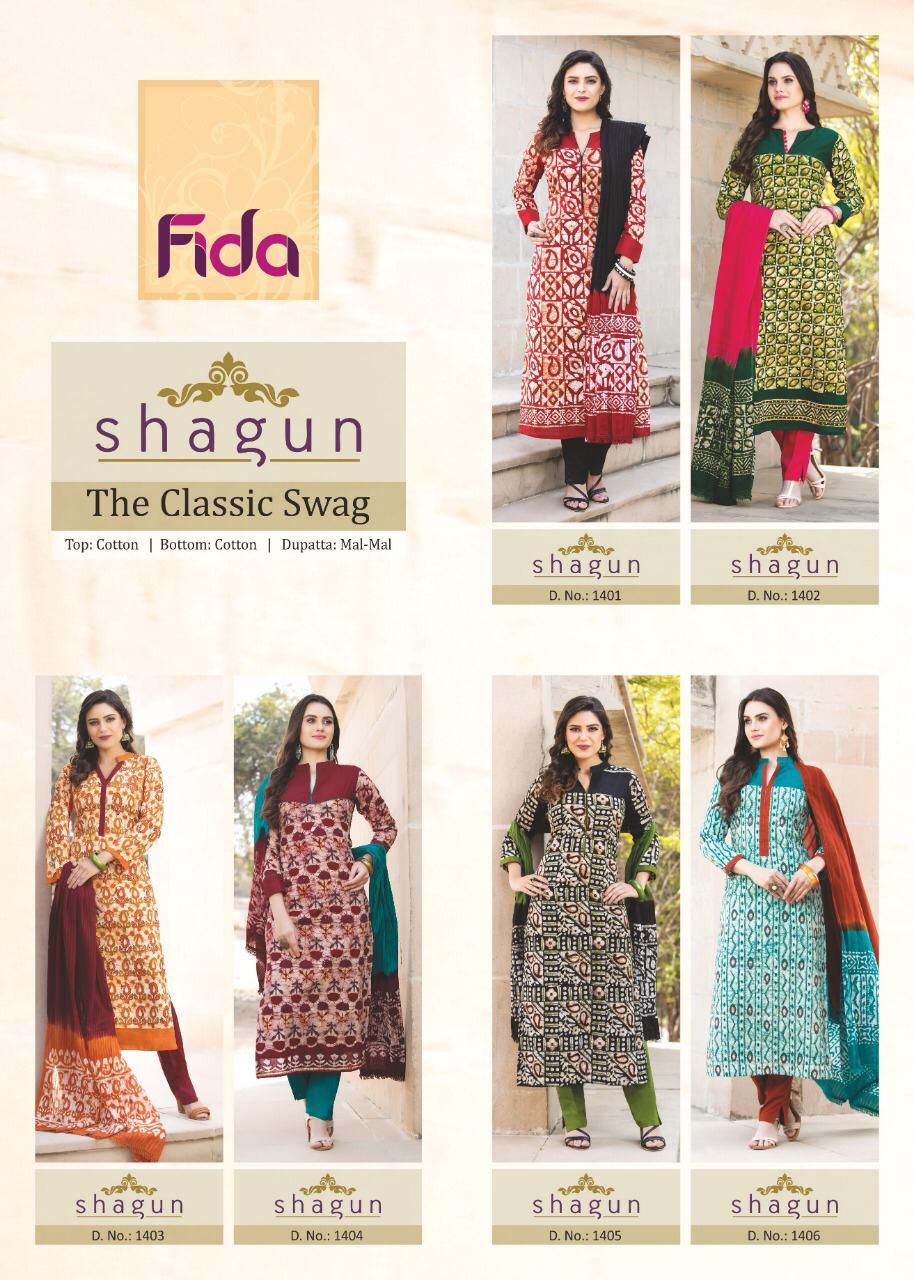 Buy Online Shagun By Fida 1401 Series Fancy Cotton Printed Salwar Kameez Catlog Wholesaler Surat 6 Pcs of Full Catalogue at Wholesale Price. Looking for Shagun By Fida 1401 Series Fancy Cotton Printed Salwar Kameez Catlog Wholesaler Surat Full Catalouge at Best Price? Buy Now Shagun By Fida 1401 Series Fancy Cotton Printed Salwar Kameez Catlog Wholesaler Surat at Wholesale Rate of Rs 5100 with Total 6 Pcs from authroized dealer and supplier of Brand. Cost of Each piece is just only Rs 850 which is very low and affordable price to resale the product in your retail store ,This is Surat based Wholesale Supplier & Dealer of Brand. Click on Brand name to Know more about Brand's products.Call or Whatsapp on 9898838984 for booking or enquiry
