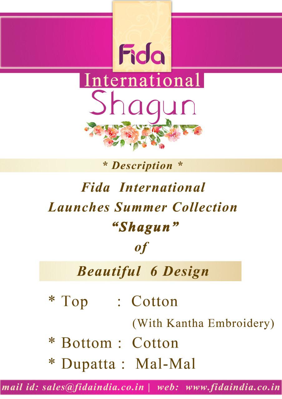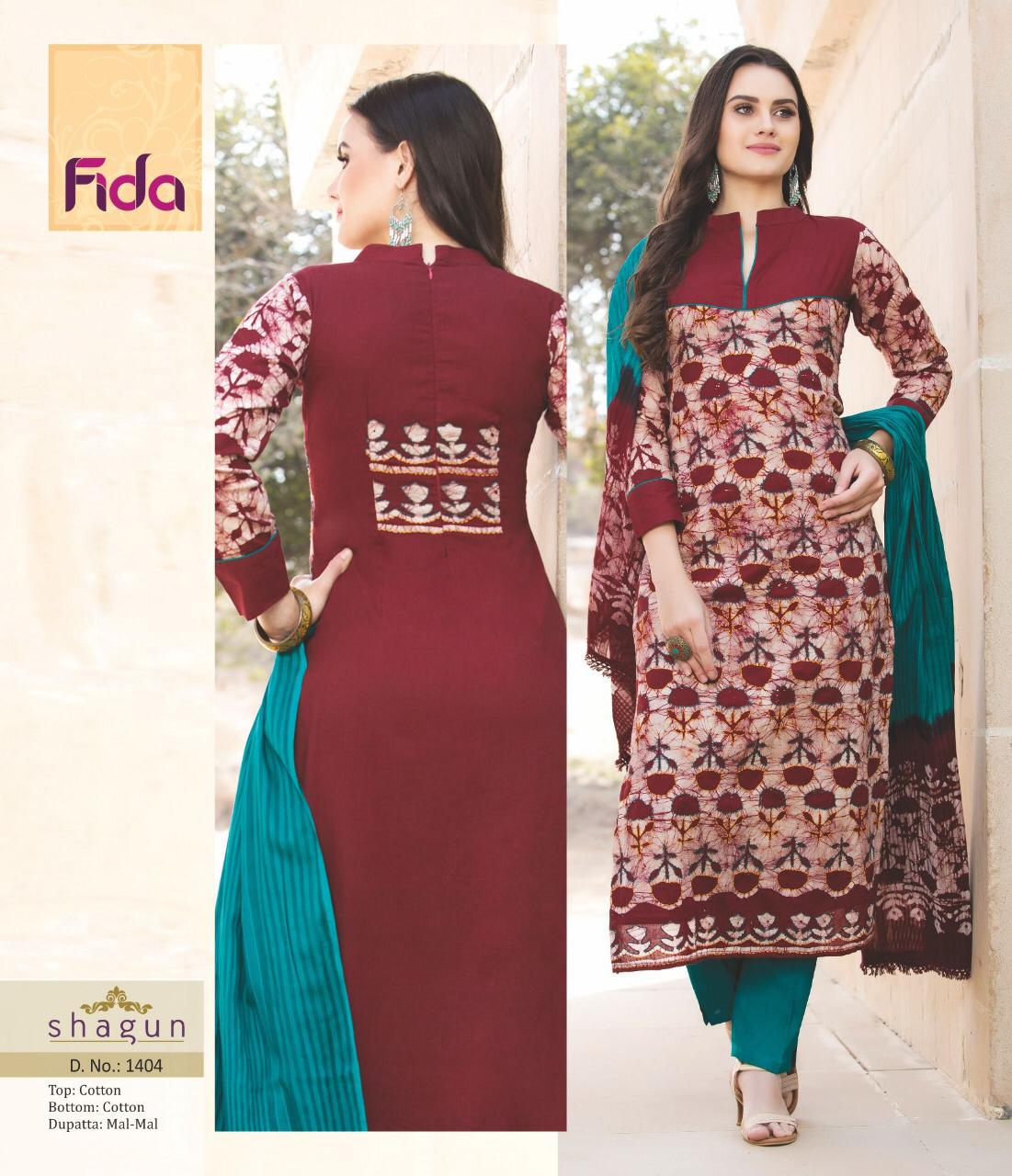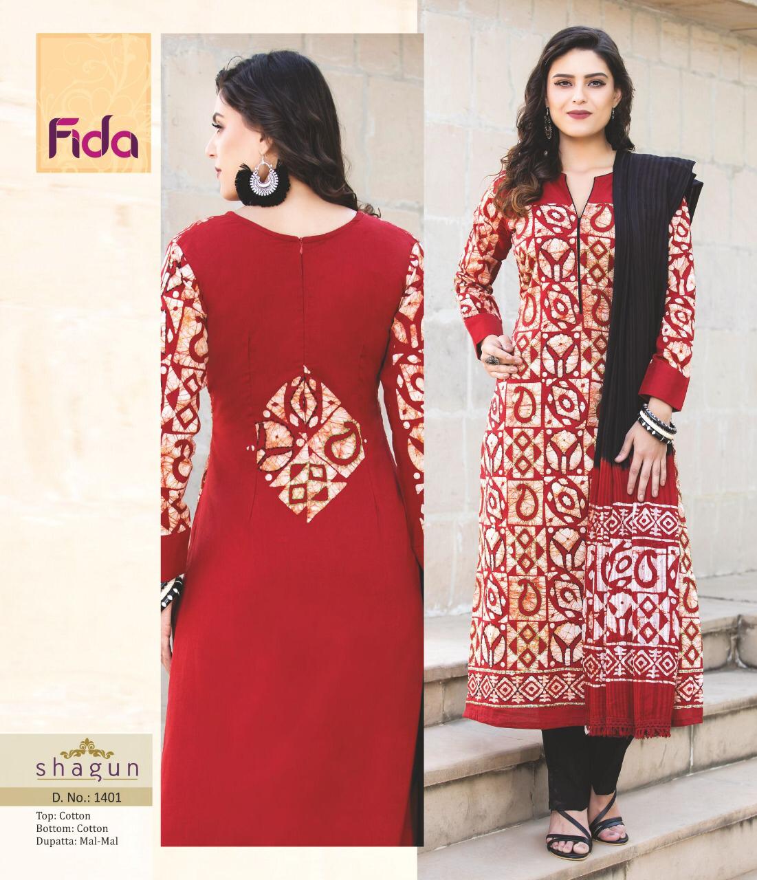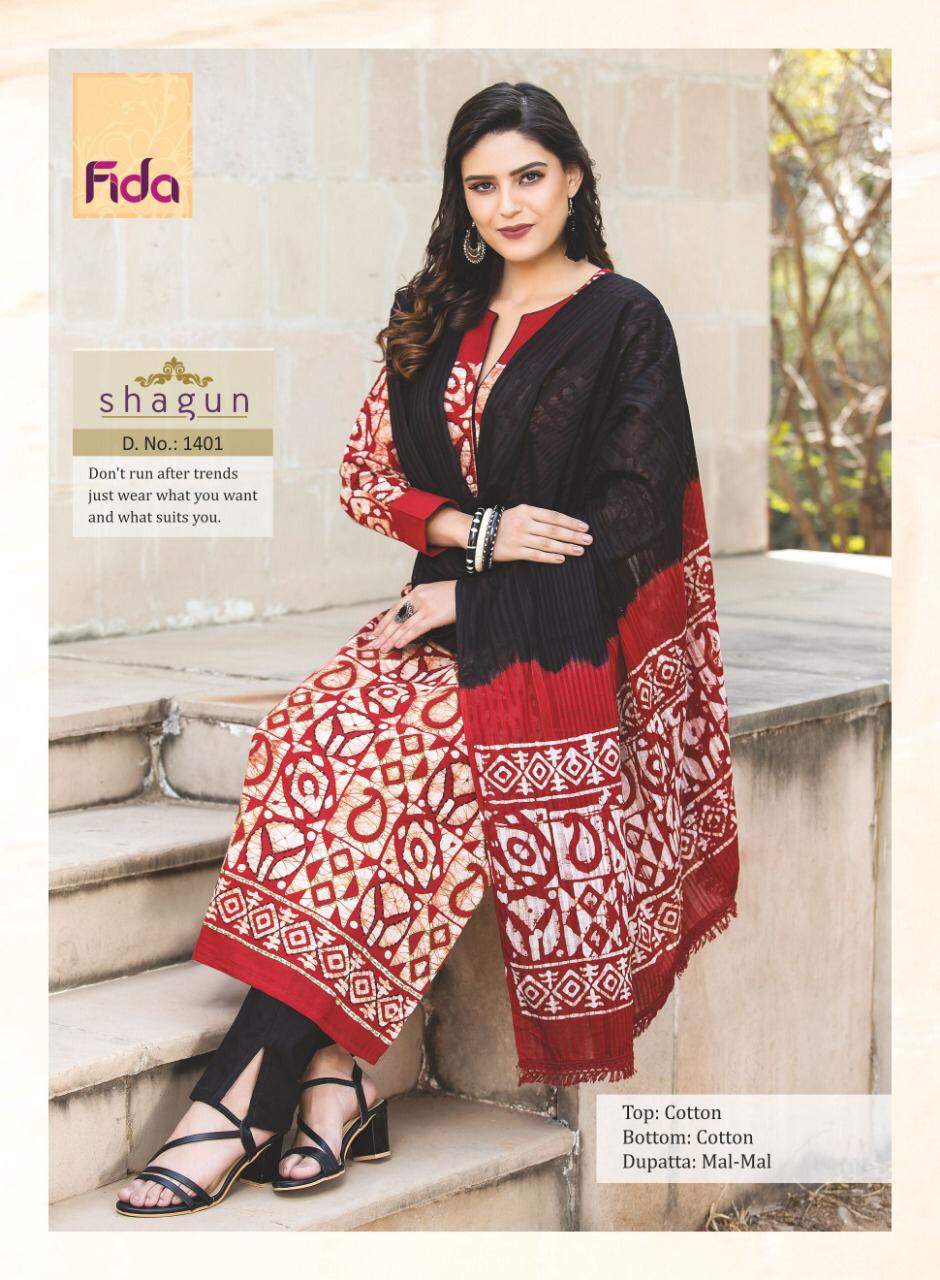 Buy Online Shagun By Fida 1401 Series Fancy Cotton Printed Salwar Kameez Catlog Wholesaler Surat 6 Pcs of Full Catalogue at Wholesale Price. Looking for Shagun By Fida 1401 Series Fancy Cotton Printed Salwar Kameez Catlog Wholesaler Surat Full Catalouge at Best Price? Buy Now Shagun By Fida 1401 Series Fancy Cotton Printed Salwar Kameez Catlog Wholesaler Surat at Wholesale Rate of Rs 5100 with Total 6 Pcs from authroized dealer and supplier of Brand. Cost of Each piece is just only Rs 850 which is very low and affordable price to resale the product in your retail store ,This is Surat based Wholesale Supplier & Dealer of Brand. Click on Brand name to Know more about Brand's products.Call or Whatsapp on 9898838984 for booking or enquiry