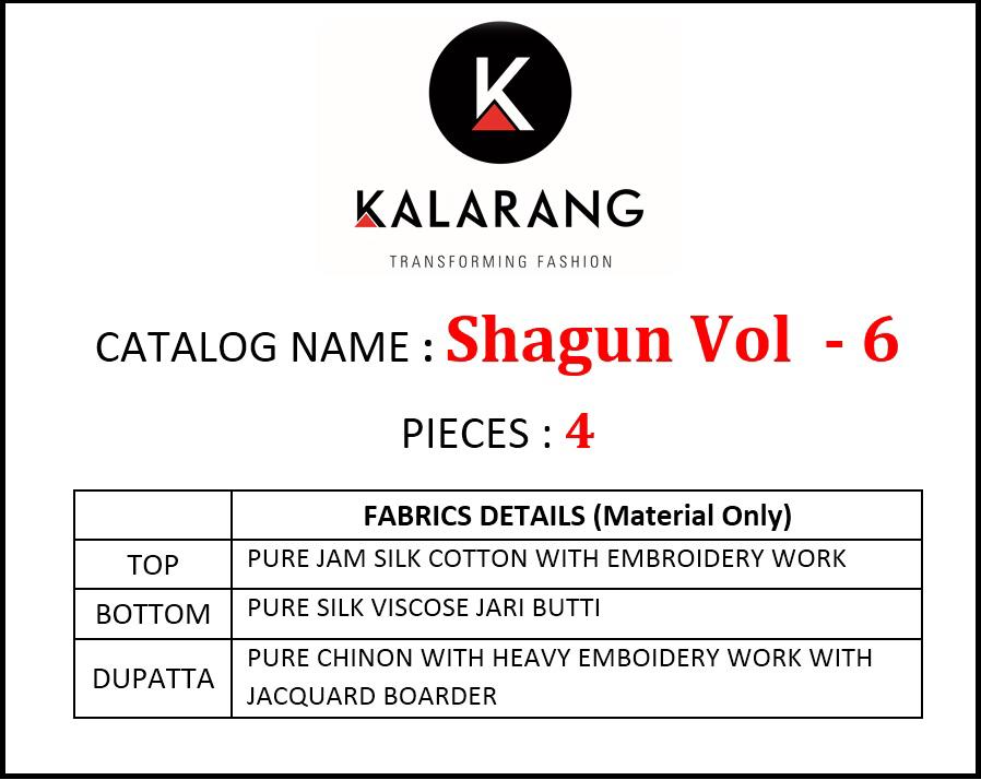 Buy Online Shagun Vol 6 By Kalarang Jam Silk Cotton Dress Materials Wholesale Supplier Surat 4 Pcs of Full Catalogue at Wholesale Price. Looking for Shagun Vol 6 By Kalarang Jam Silk Cotton Dress Materials Wholesale Supplier Surat Full Catalouge at Best Price? Buy Now Shagun Vol 6 By Kalarang Jam Silk Cotton Dress Materials Wholesale Supplier Surat at Wholesale Rate of Rs 3796 with Total 4 Pcs from authroized dealer and supplier of KALARANG Brand. Cost of Each piece is just only Rs 949 which is very low and affordable price to resale the product in your retail store ,This is Surat based Wholesale Supplier & Dealer of KALARANG Brand. Click on Brand name to Know more about KALARANG Brand's products.Call or Whatsapp on 9898838984 for booking or enquiry