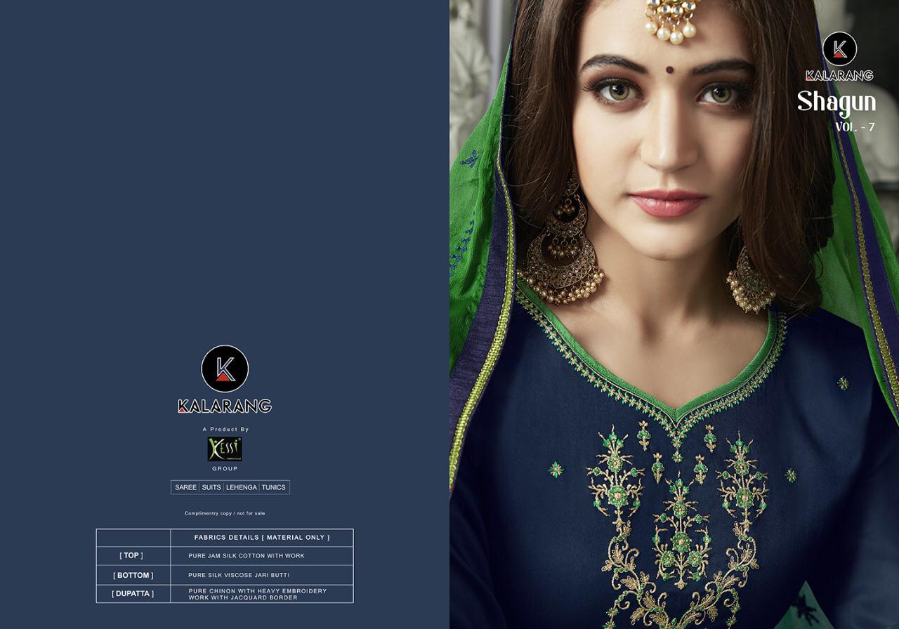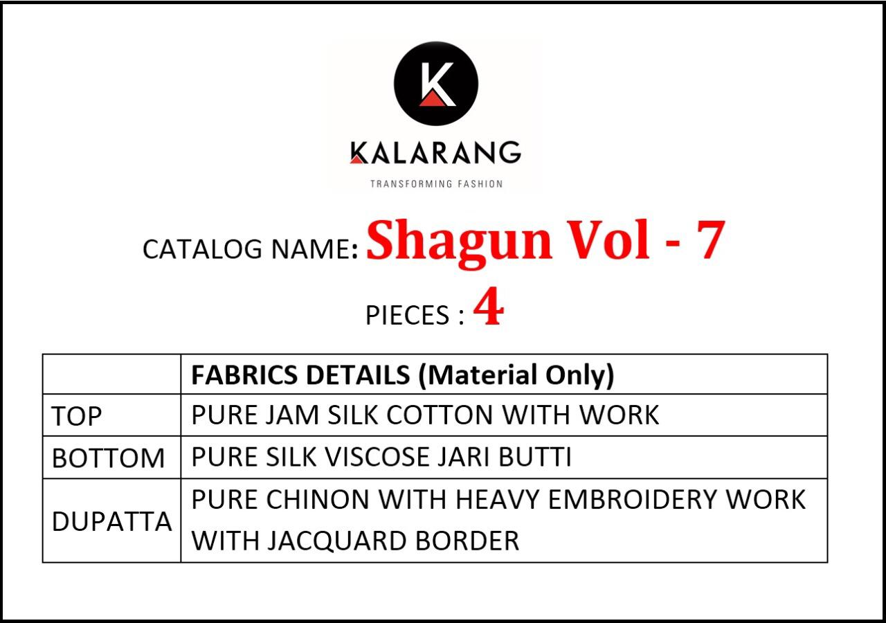 Buy Online Shagun Vol 7 By Kalarang Jam Silk Cotton Dress Materials Wholesale Supplier And Dealer Gujarat 4 Pcs of Full Catalogue at Wholesale Price. Looking for Shagun Vol 7 By Kalarang Jam Silk Cotton Dress Materials Wholesale Supplier And Dealer Gujarat Full Catalouge at Best Price? Buy Now Shagun Vol 7 By Kalarang Jam Silk Cotton Dress Materials Wholesale Supplier And Dealer Gujarat at Wholesale Rate of Rs 3796 with Total 4 Pcs from authroized dealer and supplier of KALARANG Brand. Cost of Each piece is just only Rs 949 which is very low and affordable price to resale the product in your retail store ,This is Surat based Wholesale Supplier & Dealer of KALARANG Brand. Click on Brand name to Know more about KALARANG Brand's products.Call or Whatsapp on 9898838984 for booking or enquiry