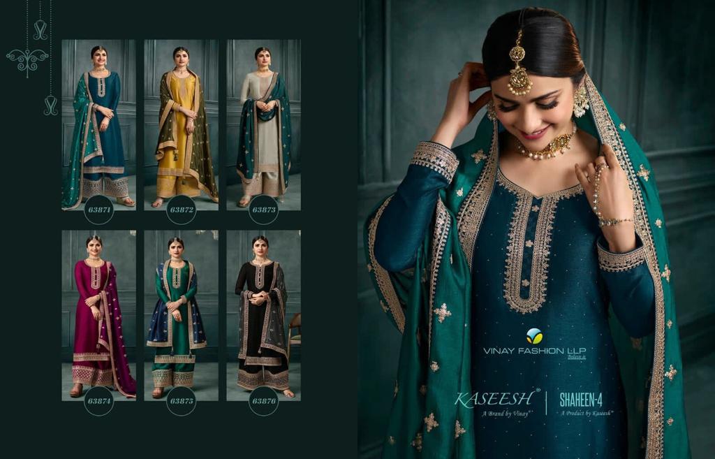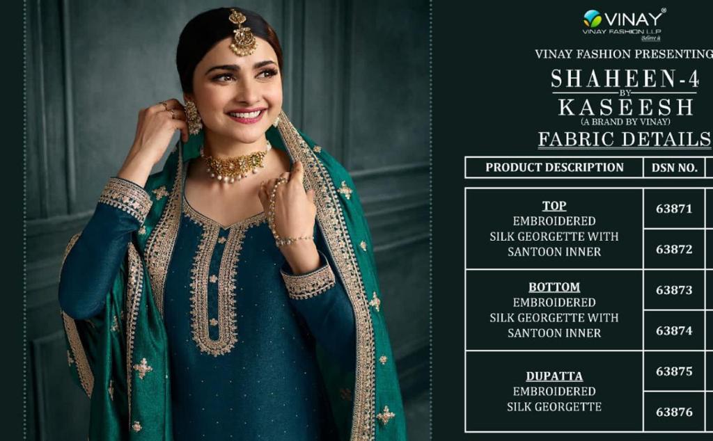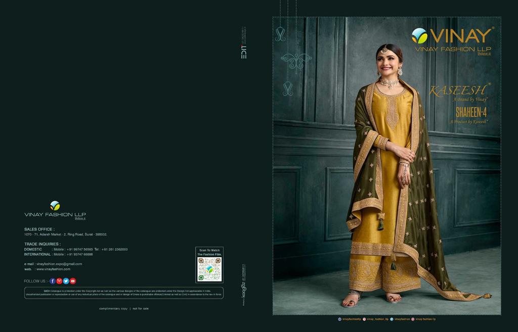 Buy Online Shaheen Vol 4 By Kaseesh Vinay Fashion Designer Suits 6 Pcs of Full Catalogue at Wholesale Price. Looking for Shaheen Vol 4 By Kaseesh Vinay Fashion Designer Suits Full Catalouge at Best Price? Buy Now Shaheen Vol 4 By Kaseesh Vinay Fashion Designer Suits at Wholesale Rate of Rs 12600 with Total 6 Pcs from authroized dealer and supplier of Brand. Cost of Each piece is just only Rs 2100 which is very low and affordable price to resale the product in your retail store ,This is Surat based Wholesale Supplier & Dealer of Brand. Click on Brand name to Know more about Brand's products.Call or Whatsapp on 9898838984 for booking or enquiry