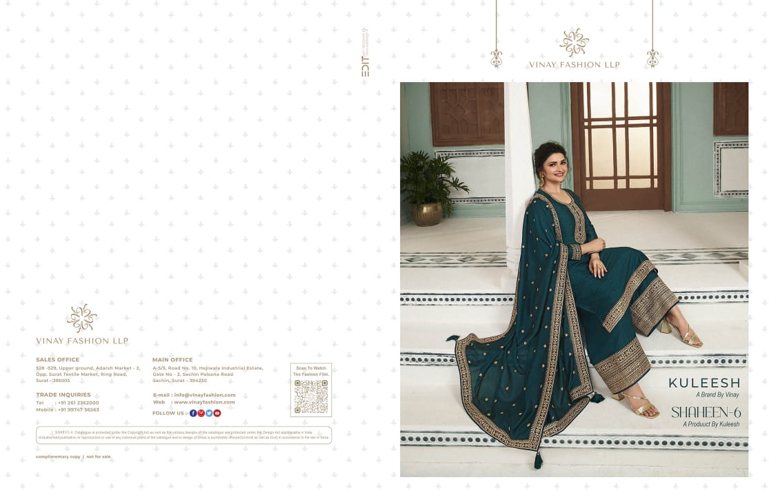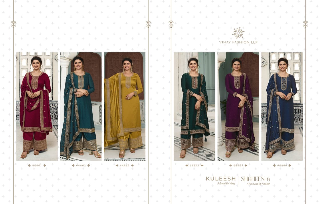 Buy Online Shaheen Vol 6 Fancy Embroidery Silk Georgette Suit By Vinay Fashion 6 Pcs of Full Catalogue at Wholesale Price. Looking for Shaheen Vol 6 Fancy Embroidery Silk Georgette Suit By Vinay Fashion Full Catalouge at Best Price? Buy Now Shaheen Vol 6 Fancy Embroidery Silk Georgette Suit By Vinay Fashion at Wholesale Rate of Rs 11730 with Total 6 Pcs from authroized dealer and supplier of Brand. Cost of Each piece is just only Rs 1955 which is very low and affordable price to resale the product in your retail store ,This is Surat based Wholesale Supplier & Dealer of Brand. Click on Brand name to Know more about Brand's products.Call or Whatsapp on 9898838984 for booking or enquiry