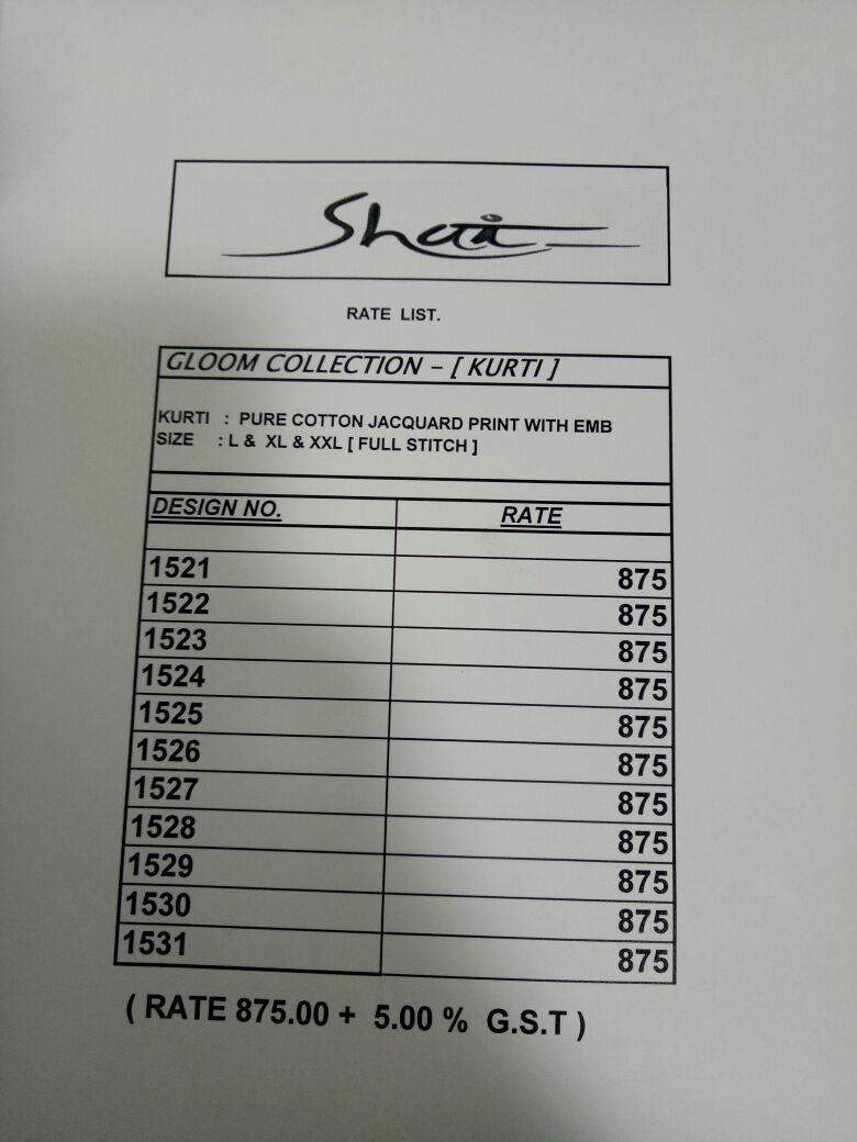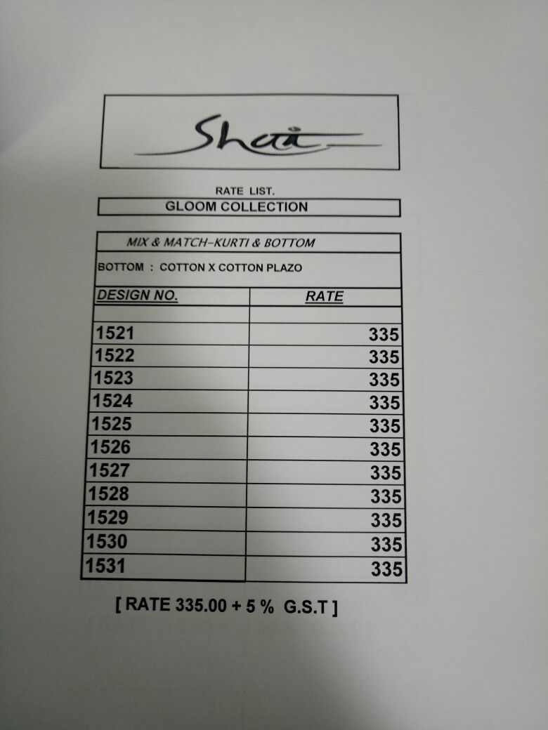 Buy Online Shai Gloom Collection 1521 Series Cotton Kurti Plazzo Dealer 11 Pcs of Full Catalogue at Wholesale Price. Looking for Shai Gloom Collection 1521 Series Cotton Kurti Plazzo Dealer Full Catalouge at Best Price? Buy Now Shai Gloom Collection 1521 Series Cotton Kurti Plazzo Dealer at Wholesale Rate of Rs 9625 with Total 11 Pcs from authroized dealer and supplier of SHAI Brand. Cost of Each piece is just only Rs 875 which is very low and affordable price to resale the product in your retail store ,This is Surat based Wholesale Supplier & Dealer of SHAI Brand. Click on Brand name to Know more about SHAI Brand's products.Call or Whatsapp on 9898838984 for booking or enquiry