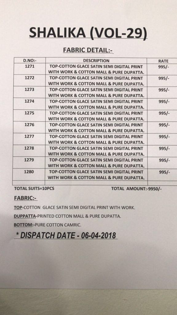 Buy Online Shalika Vol 29 Series Cotton Satin Print Suit Dealer 10 Pcs of Full Catalogue at Wholesale Price. Looking for Shalika Vol 29 Series Cotton Satin Print Suit Dealer Full Catalouge at Best Price? Buy Now Shalika Vol 29 Series Cotton Satin Print Suit Dealer at Wholesale Rate of Rs 9950 with Total 10 Pcs from authroized dealer and supplier of SHREE SHALIKA FASHION Brand. Cost of Each piece is just only Rs 995 which is very low and affordable price to resale the product in your retail store ,This is Surat based Wholesale Supplier & Dealer of SHREE SHALIKA FASHION Brand. Click on Brand name to Know more about SHREE SHALIKA FASHION Brand's products.Call or Whatsapp on 9898838984 for booking or enquiry