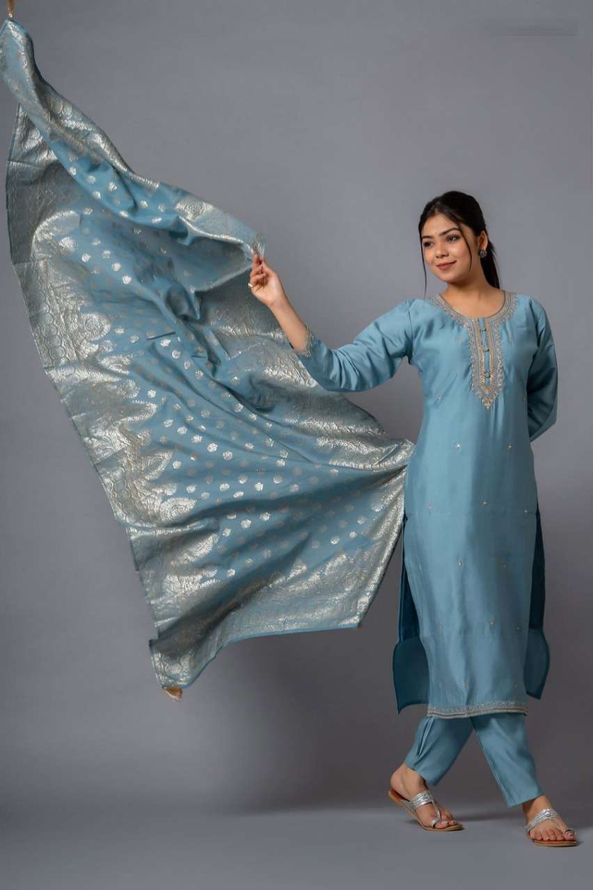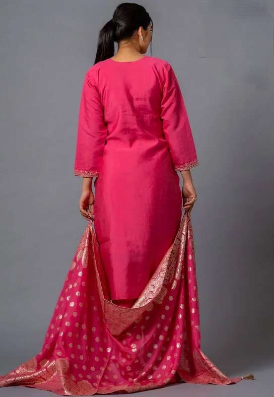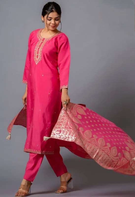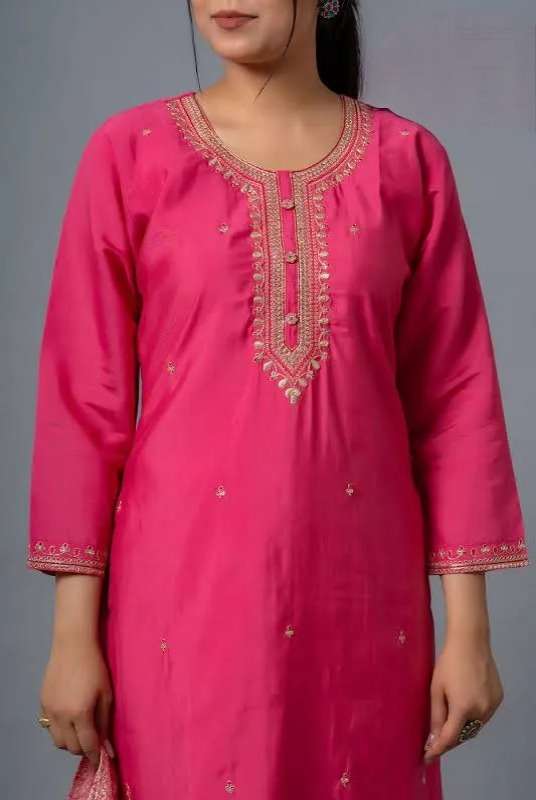 Top- Kurti Fabric-chanderi viscose Pattern-embroidery Length- 45+ Colour -grey and pink Bottom details :- Bottom- Pant Fabric- chanderi viscose Length-38 Pattern-Solid