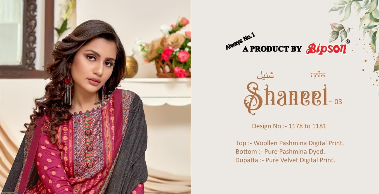 *BIPSON* Brings ```WINTER COLLECTION ``` SHANEEL - 3 1178-1181 TOP* :-Woollen Pashmina Digital Classic Print 2.5mtr Bottom* :- Pure Pashmina Solid Dyed .2.7Mtr Dupatta* :- Pure Velvet 9000 Digital Beautiful Print 2.25mtr @ 895/- Only per PCÂ?s s Set to set. Pashmina |