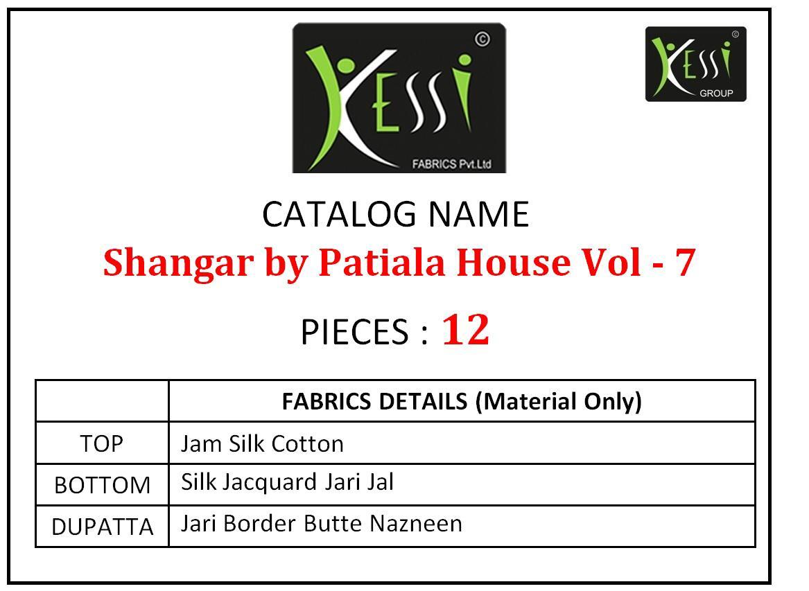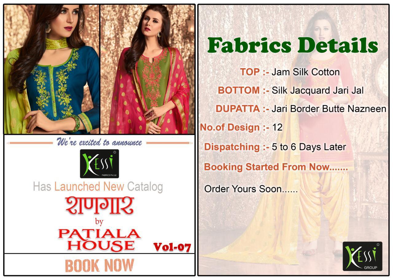 ? *Kessi Fabrics Pvt. Ltd.* has launched _Catalog name_ : *Shangar by Patiala House Vol - 7* ? _Fabric Details_ ? ?Top :- Jam Silk Cotton ?Bottom:- Silk Jacquard Jari Jal ?Dupatta:- Jari Border Butte Nazneen ?Total Design :- 12 ?Dispatching 5 to 6 days later ?Booking started from now... ?Order yours soon.... Rate -899 per pcs . Set to set. GST 5 Percent Extra. |