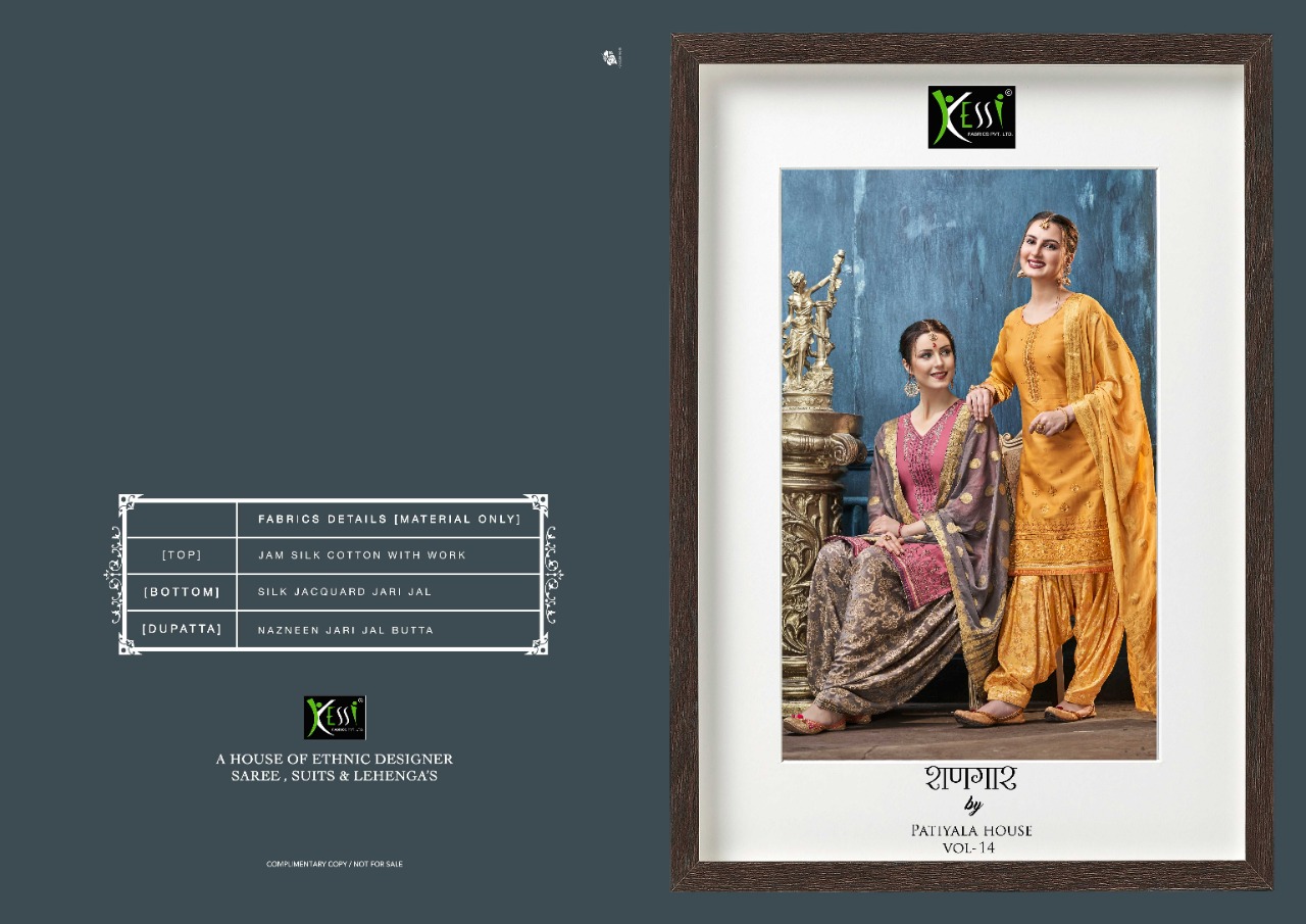 ? *Kessi Fabrics Pvt. Ltd.* has launched _Catalog name_ : *Shangar by Patiala Vol - 14* ? _Fabric Details_ ? ?Top:- Jam Silk Cotton with Work ?Bottom:- Silk Jacquard Jari Jal ?Dupatta:- Nazneen Jari Border Butta ?Total Design:- 8 RATE - 899 /- |