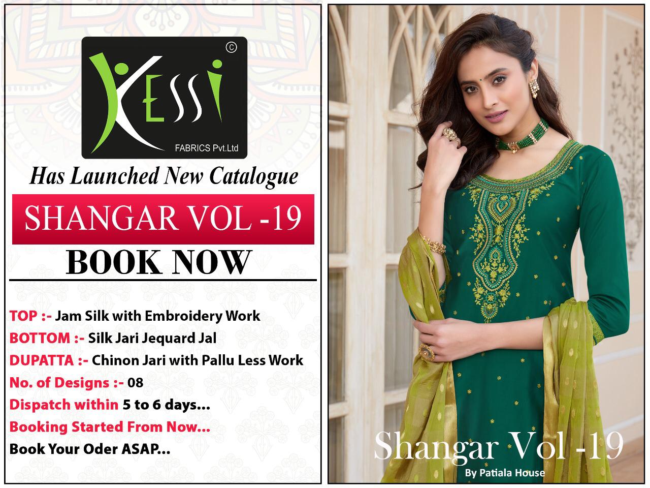 ? *Kessi Fabrics Pvt. Ltd.* has launched _Catalog name_ : *Shangar by Patiala House Vol - 19* ? _Fabric Details_ ? ?Top:- Jam Silk with Embroidery Work ?Bottom:- Silk Jacquard Jari Jal ?Dupatta:- Chinon Jari Buti with Pallu less Work ?Total Design:- 8 Rate - 899/- Set to set ?Dispatching 5 to 6 days later ?Booking started from now... ?Order yours soon... |