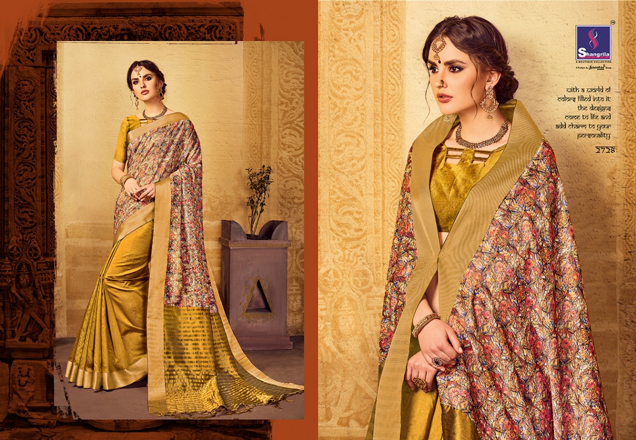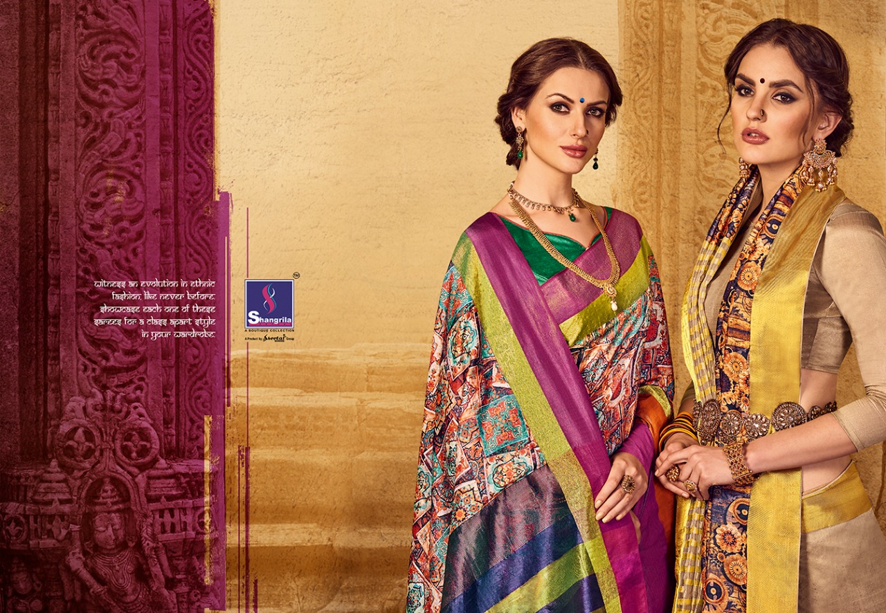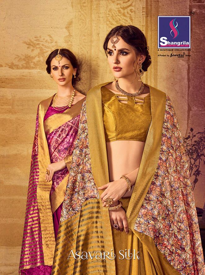 Asavari silk by Sangrila. Shangrila presents latest handloom silk collection topped with fancy digital prints and rich colours and designs. 12 pcs 12 design 585/- Set to set . GST 5 Percent Extra. Delivery-31-05-18. Book your order |