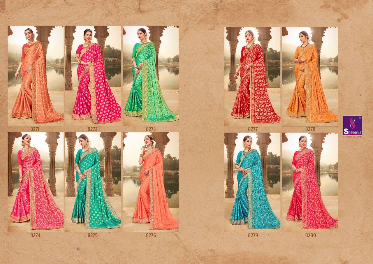 Buy Online Shangrila Padmini Silk 2 8271 Series Fancy Silk Saree Dealer 10 Pcs of Full Catalogue at Wholesale Price. Looking for Shangrila Padmini Silk 2 8271 Series Fancy Silk Saree Dealer Full Catalouge at Best Price? Buy Now Shangrila Padmini Silk 2 8271 Series Fancy Silk Saree Dealer at Wholesale Rate of Rs 11950 with Total 10 Pcs from authroized dealer and supplier of SHANGRILA Brand. Cost of Each piece is just only Rs 1195 which is very low and affordable price to resale the product in your retail store ,This is Surat based Wholesale Supplier & Dealer of SHANGRILA Brand. Click on Brand name to Know more about SHANGRILA Brand's products.Call or Whatsapp on 9898838984 for booking or enquiry