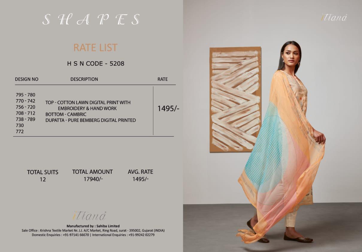 Buy Online Shapes By Itrana Sahiba Fancy Cotton Lawn Digital Printed Salwar Kameez Catlog Wholesaler Surat 12 Pcs of Full Catalogue at Wholesale Price. Looking for Shapes By Itrana Sahiba Fancy Cotton Lawn Digital Printed Salwar Kameez Catlog Wholesaler Surat Full Catalouge at Best Price? Buy Now Shapes By Itrana Sahiba Fancy Cotton Lawn Digital Printed Salwar Kameez Catlog Wholesaler Surat at Wholesale Rate of Rs 17940 with Total 12 Pcs from authroized dealer and supplier of ITRANA Brand. Cost of Each piece is just only Rs 1495 which is very low and affordable price to resale the product in your retail store ,This is Surat based Wholesale Supplier & Dealer of ITRANA Brand. Click on Brand name to Know more about ITRANA Brand's products.Call or Whatsapp on 9898838984 for booking or enquiry