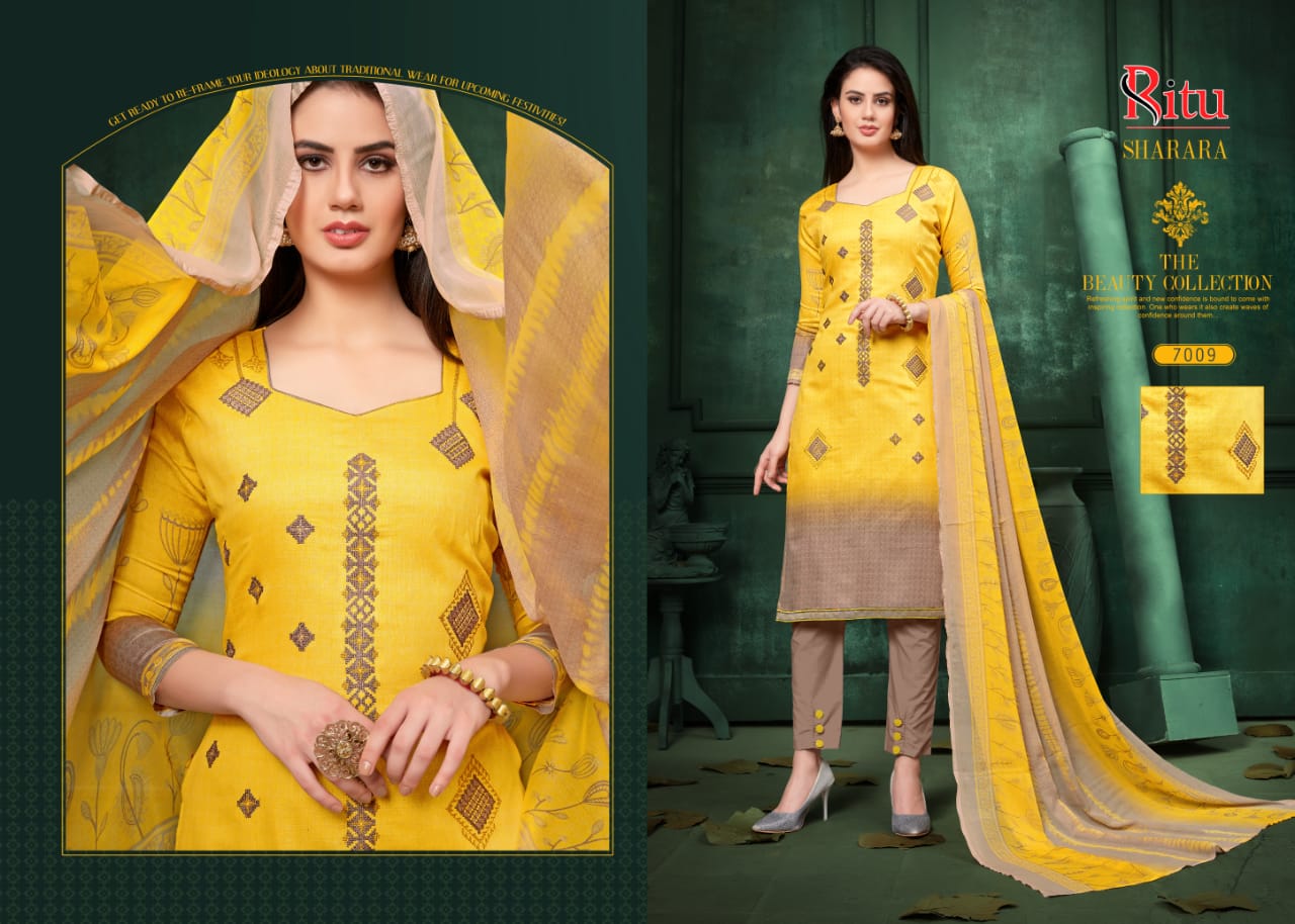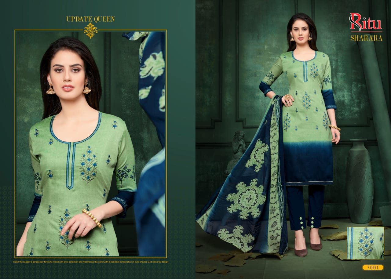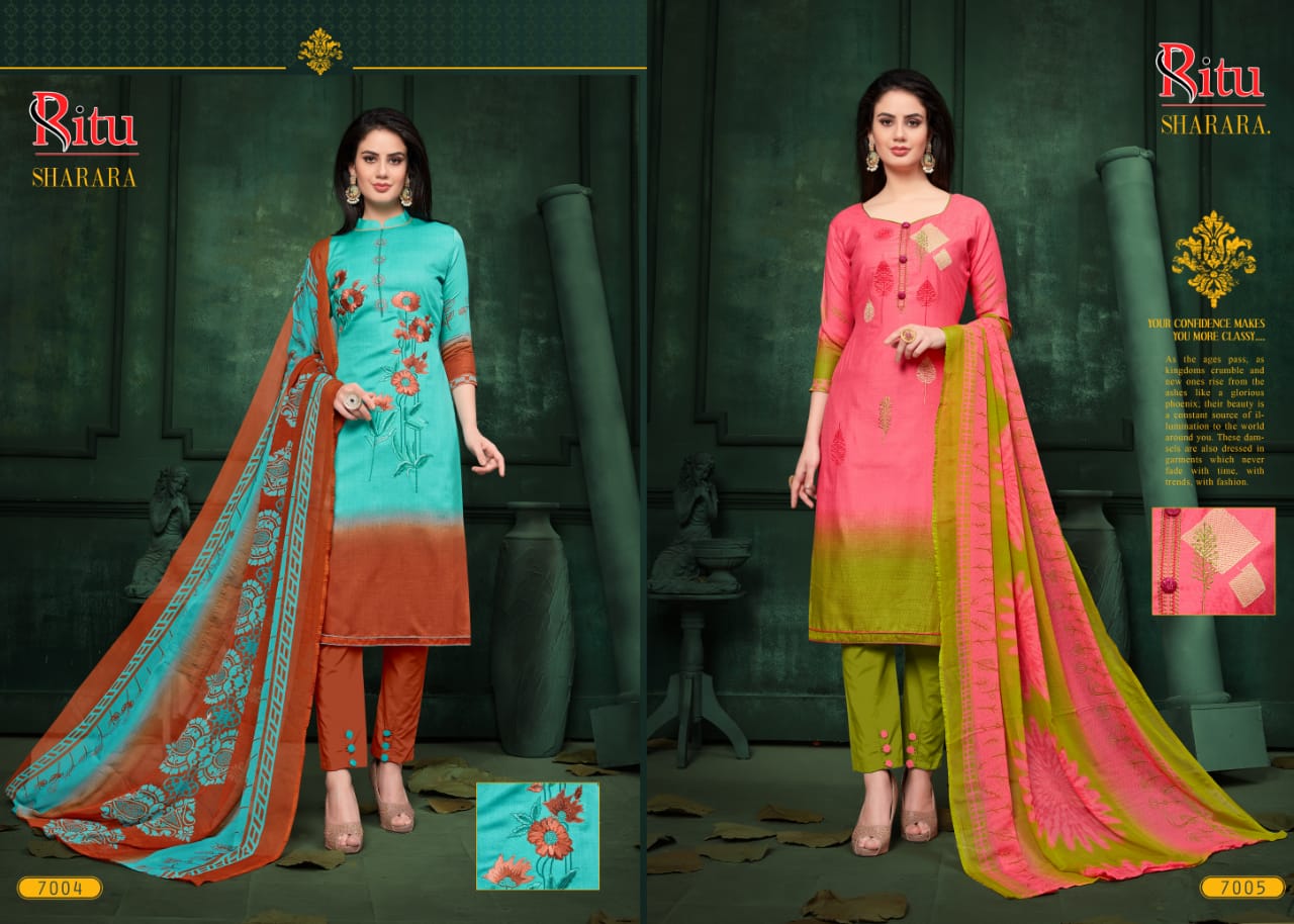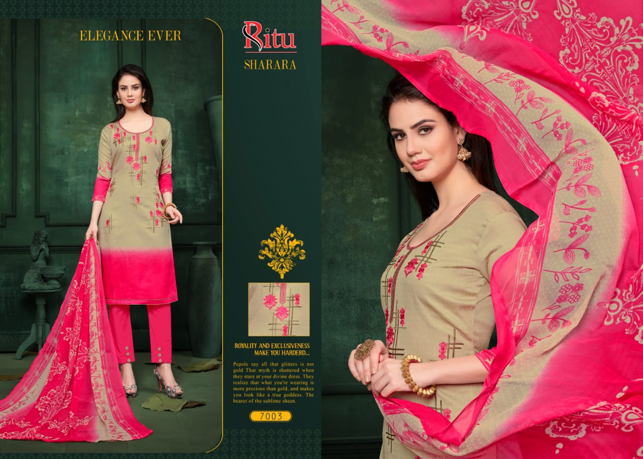 Buy Online Sharara Vol 7 By Ritu 7001 Series Fancy Pure Cotton Satin Salwar Kameez Catlog Wholesale Dealer Surat 10 Pcs of Full Catalogue at Wholesale Price. Looking for Sharara Vol 7 By Ritu 7001 Series Fancy Pure Cotton Satin Salwar Kameez Catlog Wholesale Dealer Surat Full Catalouge at Best Price? Buy Now Sharara Vol 7 By Ritu 7001 Series Fancy Pure Cotton Satin Salwar Kameez Catlog Wholesale Dealer Surat at Wholesale Rate of Rs 5950 with Total 10 Pcs from authroized dealer and supplier of Brand. Cost of Each piece is just only Rs 595 which is very low and affordable price to resale the product in your retail store ,This is Surat based Wholesale Supplier & Dealer of Brand. Click on Brand name to Know more about Brand's products.Call or Whatsapp on 9898838984 for booking or enquiry