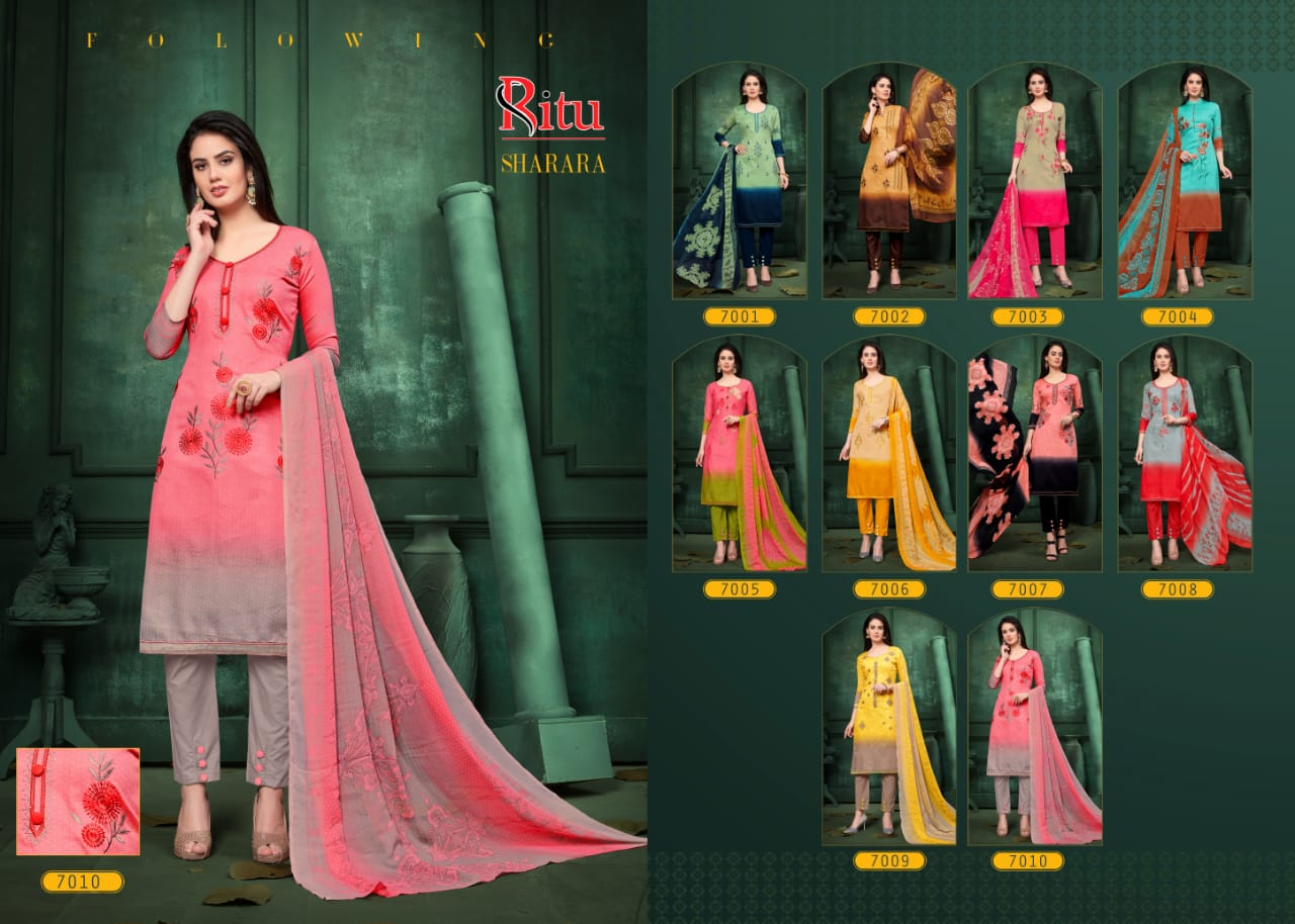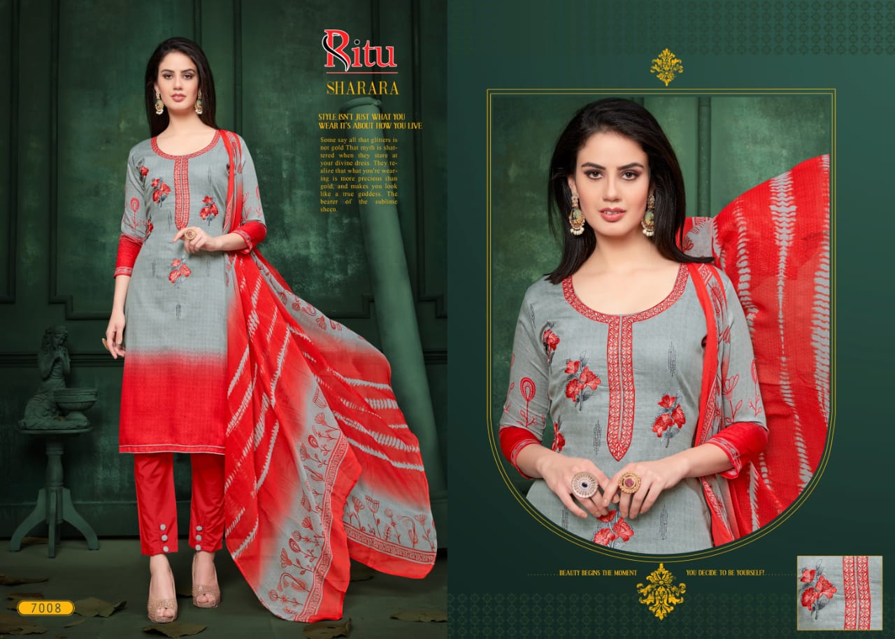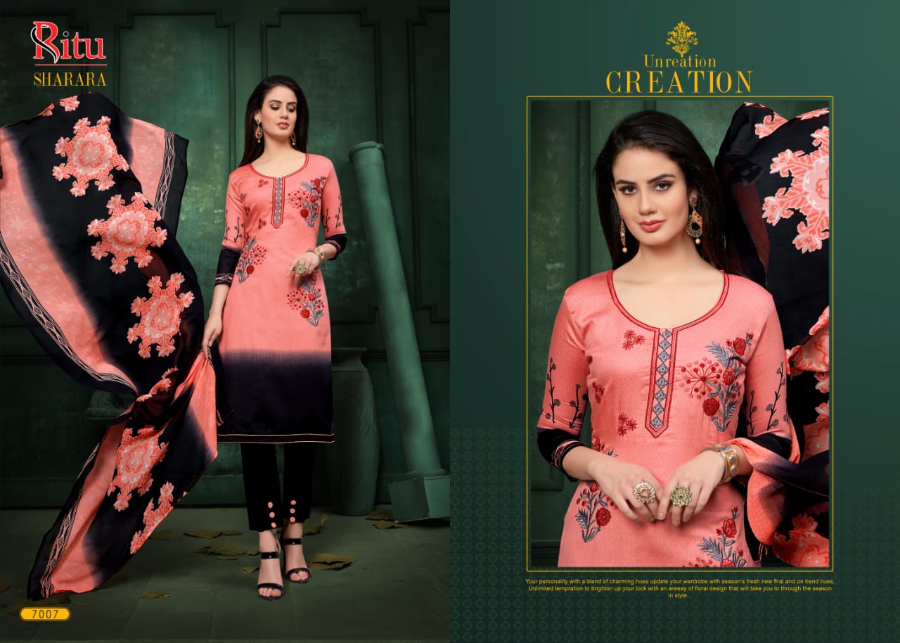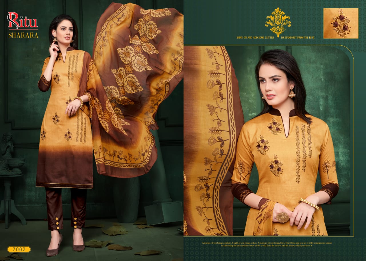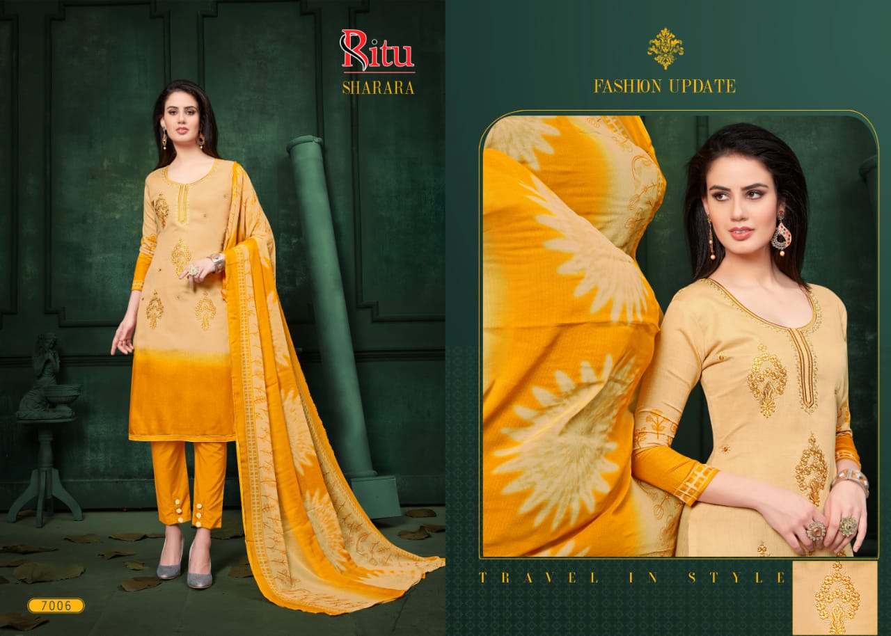 Buy Online Sharara Vol 7 By Ritu 7001 Series Fancy Pure Cotton Satin Salwar Kameez Catlog Wholesale Dealer Surat 10 Pcs of Full Catalogue at Wholesale Price. Looking for Sharara Vol 7 By Ritu 7001 Series Fancy Pure Cotton Satin Salwar Kameez Catlog Wholesale Dealer Surat Full Catalouge at Best Price? Buy Now Sharara Vol 7 By Ritu 7001 Series Fancy Pure Cotton Satin Salwar Kameez Catlog Wholesale Dealer Surat at Wholesale Rate of Rs 5950 with Total 10 Pcs from authroized dealer and supplier of Brand. Cost of Each piece is just only Rs 595 which is very low and affordable price to resale the product in your retail store ,This is Surat based Wholesale Supplier & Dealer of Brand. Click on Brand name to Know more about Brand's products.Call or Whatsapp on 9898838984 for booking or enquiry