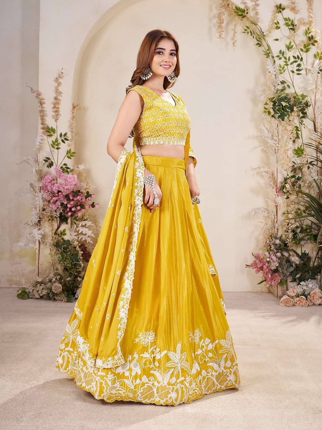 *Lehenga(Semi - Stitched)* Lehenga Fabric : Chinon Silk Lehenga Work : Sequins and embroidery Work Lehenga Waist : Support Up To 44 Stitching : stitching with Canvas and Can-Can Length : 43 Flair : 3.50 Mtr Inner : Micro Cotton
