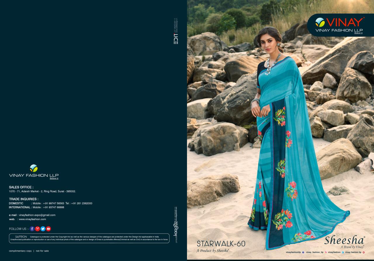 https://youtu.be/sJi4LP2Kb4s *SHEESHA - STARWALK 60* *Printed Georgette With Swarovski work on Saree & Blouse* *Per PCs PRICE :- 735/-* *NOTE :- GST WILL CHARGE AS APPLICABLE* Set to set. Delivery 5-6 days ? 25/Piece will charge *EXTRA* For BOX Packing. |