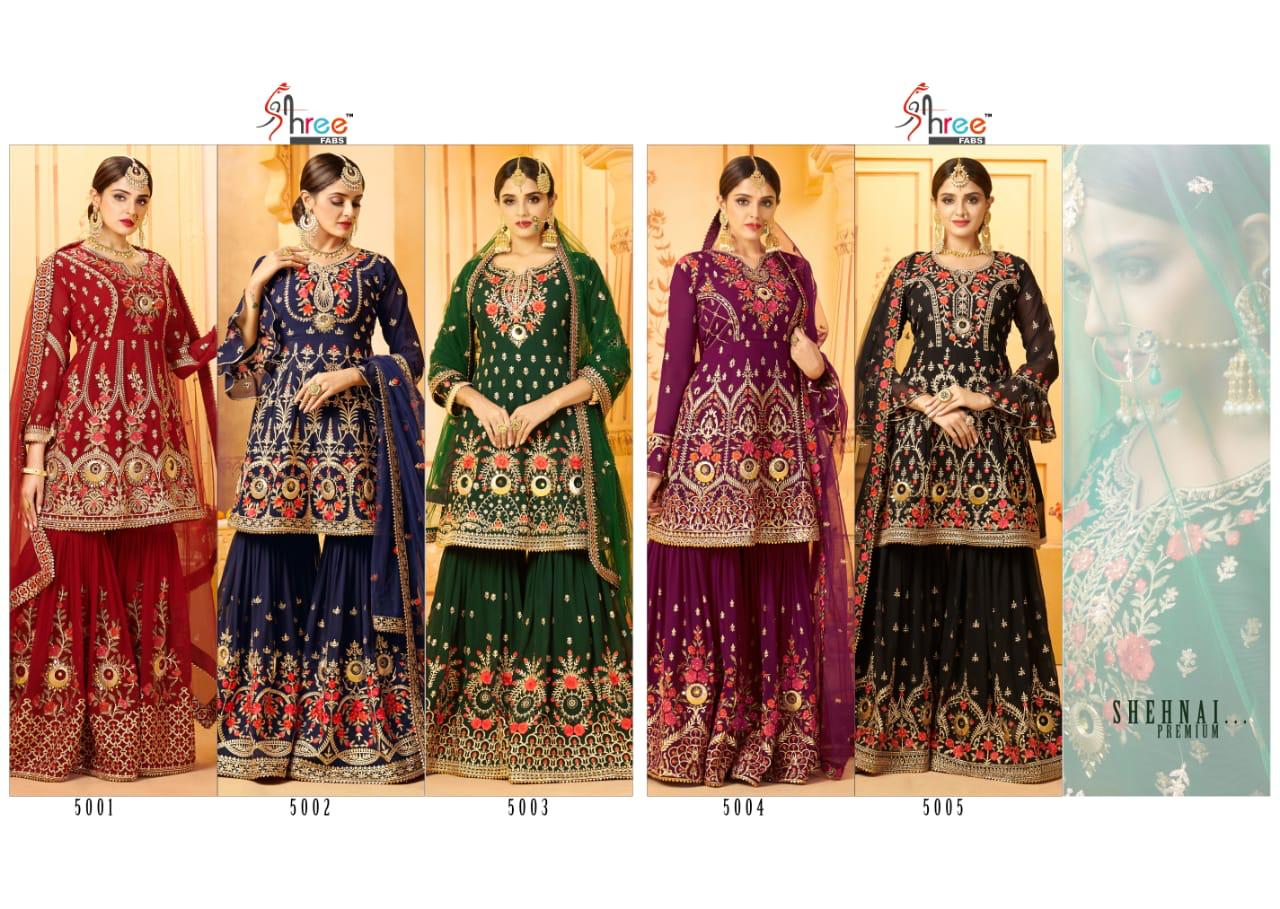 Shehnai premium by Shree fabs series 5001 to 5005 Georgette embroidered designer party wear gharara suits wholesale supplier Gujarat |