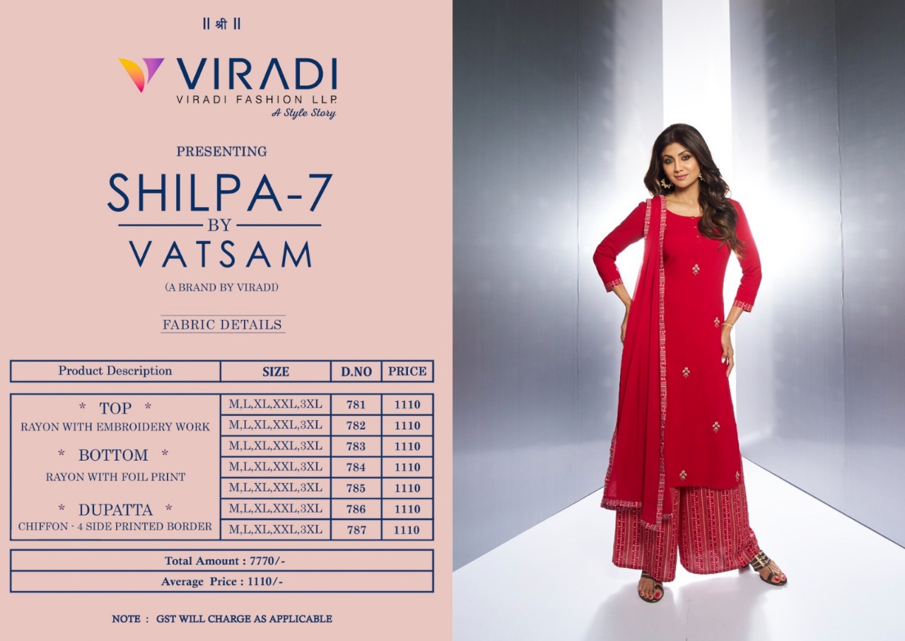 Buy Online Shilpa Vol 7 New Series Polo Vatsam Rayon Top Bottom Duppata Collection 7 Pcs of Full Catalogue at Wholesale Price. Looking for Shilpa Vol 7 New Series Polo Vatsam Rayon Top Bottom Duppata Collection Full Catalouge at Best Price? Buy Now Shilpa Vol 7 New Series Polo Vatsam Rayon Top Bottom Duppata Collection at Wholesale Rate of Rs 7770 with Total 7 Pcs from authroized dealer and supplier of VINAY Brand. Cost of Each piece is just only Rs 1110 which is very low and affordable price to resale the product in your retail store ,This is Surat based Wholesale Supplier & Dealer of VINAY Brand. Click on Brand name to Know more about VINAY Brand's products.Call or Whatsapp on 9898838984 for booking or enquiry