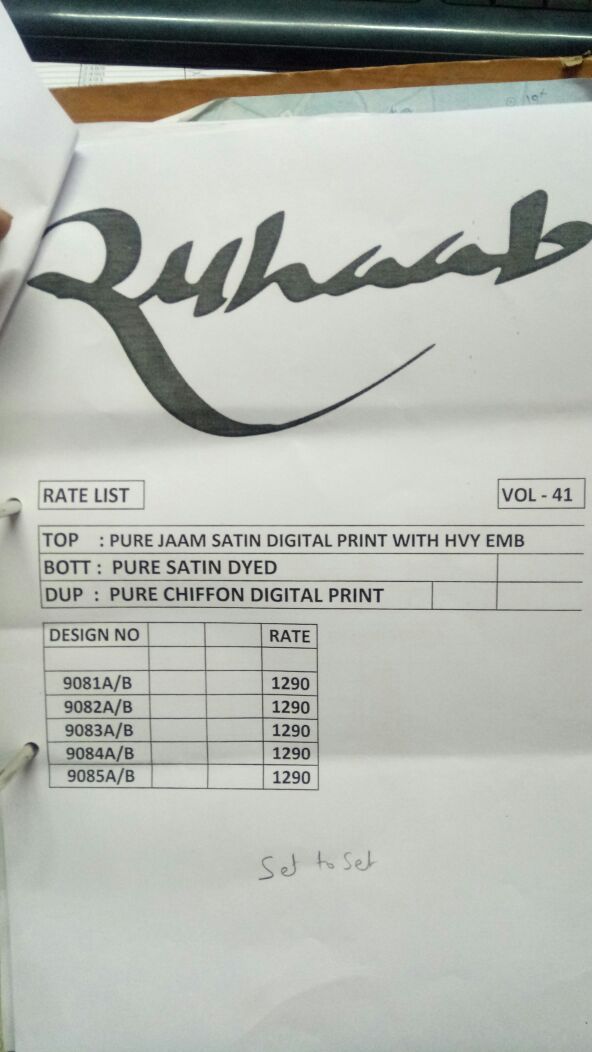 Buy Online Shivam Ruhaab Elite 9081 Series Jam Satin Print Suit Saller 10 Pcs of Full Catalogue at Wholesale Price. Looking for Shivam Ruhaab Elite 9081 Series Jam Satin Print Suit Saller Full Catalouge at Best Price? Buy Now Shivam Ruhaab Elite 9081 Series Jam Satin Print Suit Saller at Wholesale Rate of Rs 12900 with Total 10 Pcs from authroized dealer and supplier of Shivam Brand. Cost of Each piece is just only Rs 1290 which is very low and affordable price to resale the product in your retail store ,This is Surat based Wholesale Supplier & Dealer of Shivam Brand. Click on Brand name to Know more about Shivam Brand's products.Call or Whatsapp on 9898838984 for booking or enquiry