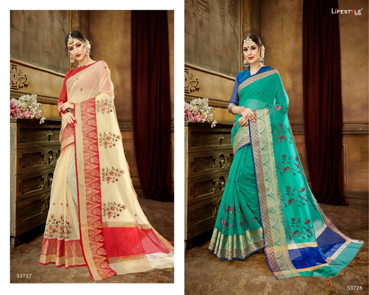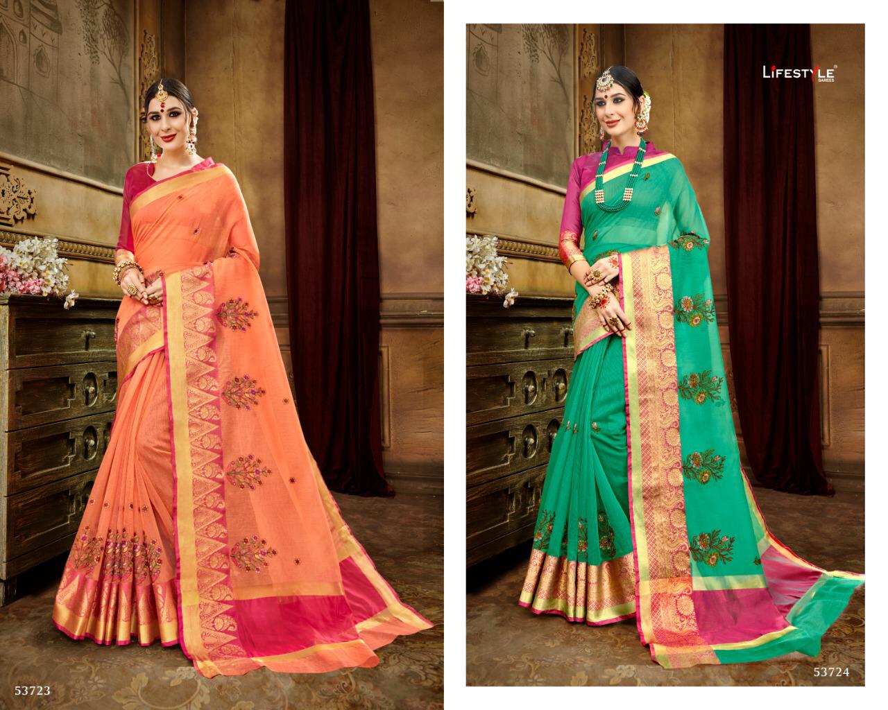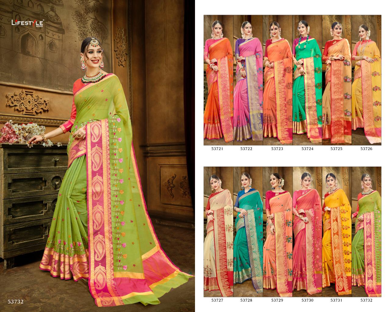 Buy Online Shivoham By Lifestyle 53721 Series Fancy Weaving Cotton Silk Saree Collection Wholesaler Surat 12 Pcs of Full Catalogue at Wholesale Price. Looking for Shivoham By Lifestyle 53721 Series Fancy Weaving Cotton Silk Saree Collection Wholesaler Surat Full Catalouge at Best Price? Buy Now Shivoham By Lifestyle 53721 Series Fancy Weaving Cotton Silk Saree Collection Wholesaler Surat at Wholesale Rate of Rs 12000 with Total 12 Pcs from authroized dealer and supplier of LIFESTYLE Brand. Cost of Each piece is just only Rs 1000 which is very low and affordable price to resale the product in your retail store ,This is Surat based Wholesale Supplier & Dealer of LIFESTYLE Brand. Click on Brand name to Know more about LIFESTYLE Brand's products.Call or Whatsapp on 9898838984 for booking or enquiry