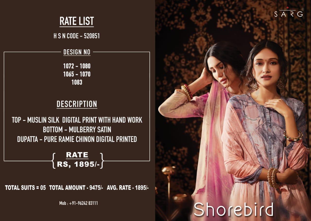 Buy Online Shorebird By Sarg By Sahiba Muslin Silk Digital Print With Handwork Suits 5 Pcs of Full Catalogue at Wholesale Price. Looking for Shorebird By Sarg By Sahiba Muslin Silk Digital Print With Handwork Suits Full Catalouge at Best Price? Buy Now Shorebird By Sarg By Sahiba Muslin Silk Digital Print With Handwork Suits at Wholesale Rate of Rs 9475 with Total 5 Pcs from authroized dealer and supplier of SAHIBA Brand. Cost of Each piece is just only Rs 1895 which is very low and affordable price to resale the product in your retail store ,This is Surat based Wholesale Supplier & Dealer of SAHIBA Brand. Click on Brand name to Know more about SAHIBA Brand's products.Call or Whatsapp on 9898838984 for booking or enquiry