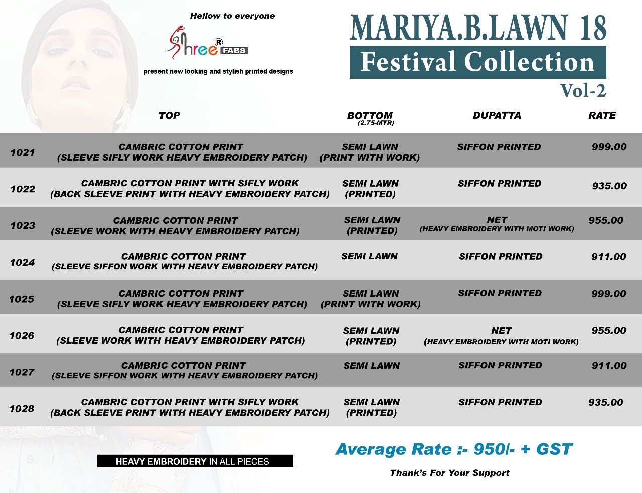 Buy Online Shree Fabs Mariya B Lawn 18 Fastival Collection 1021 Series 8 Pcs of Full Catalogue at Wholesale Price. Looking for Shree Fabs Mariya B Lawn 18 Fastival Collection 1021 Series Full Catalouge at Best Price? Buy Now Shree Fabs Mariya B Lawn 18 Fastival Collection 1021 Series at Wholesale Rate of Rs 7600 with Total 8 Pcs from authroized dealer and supplier of SHREE FABS Brand. Cost of Each piece is just only Rs 950 which is very low and affordable price to resale the product in your retail store ,This is Surat based Wholesale Supplier & Dealer of SHREE FABS Brand. Click on Brand name to Know more about SHREE FABS Brand's products.Call or Whatsapp on 9898838984 for booking or enquiry