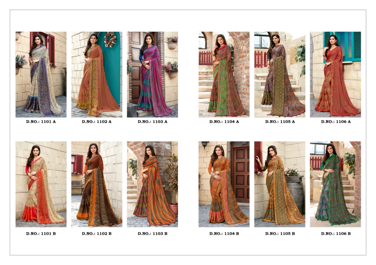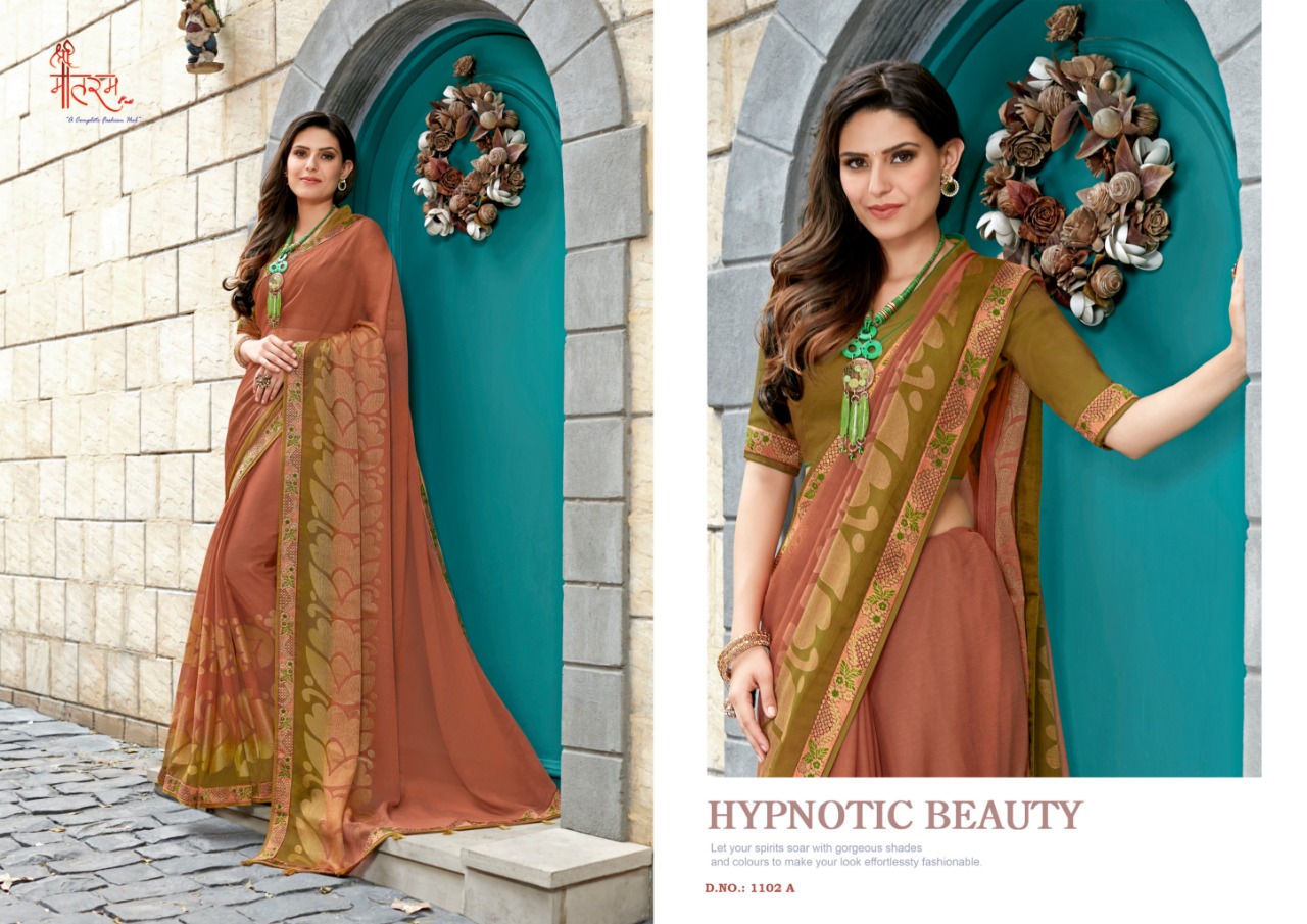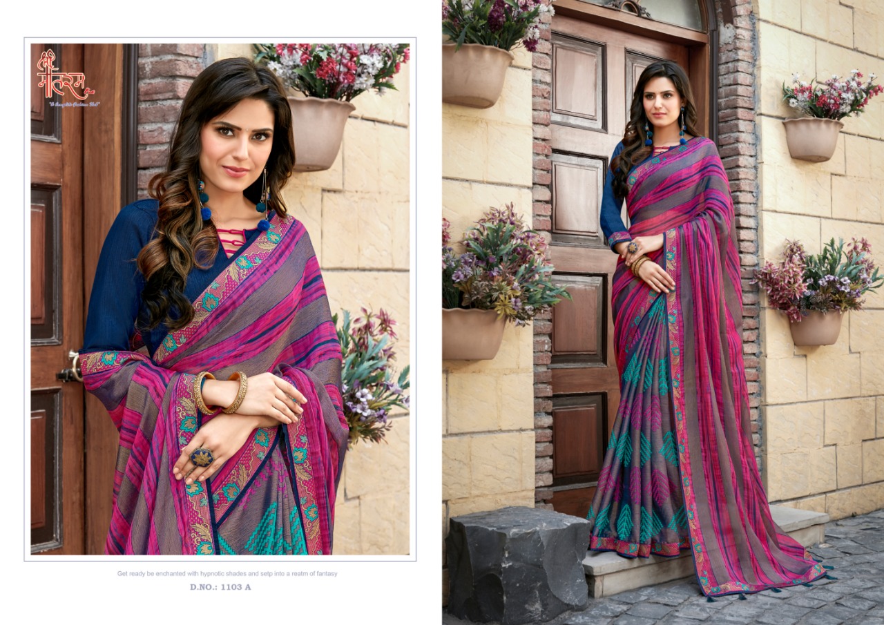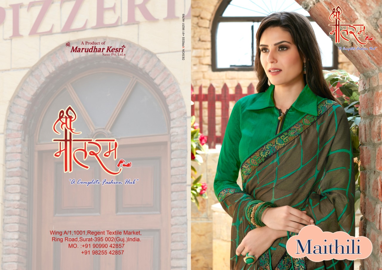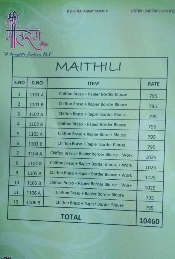 Brand - Shree Mataram. Type - Saree. Catlog name Â? MAITHLI . Set to set . Series -1101 A B to 1106 A B. Total 12 Pcs in one set. GST 5 Percent Extra. Delivery-11-05-18. Book your order |