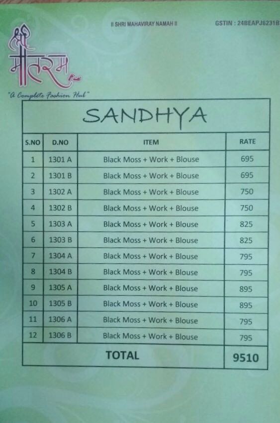 Brand - Shree Mathram. Type - saree. Catlog name - SANDHYA. Set to set . GST 5 Percent Extra. Delivery date - 12-05-18. |
