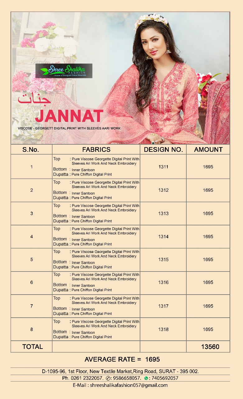 Buy Online Shree Shalika Fashion Jannat 1311 Series Pure Georgette Salwar Kameez Wholesale Dealer And Supplier Surat 8 Pcs of Full Catalogue at Wholesale Price. Looking for Shree Shalika Fashion Jannat 1311 Series Pure Georgette Salwar Kameez Wholesale Dealer And Supplier Surat Full Catalouge at Best Price? Buy Now Shree Shalika Fashion Jannat 1311 Series Pure Georgette Salwar Kameez Wholesale Dealer And Supplier Surat at Wholesale Rate of Rs 13560 with Total 8 Pcs from authroized dealer and supplier of SHREE SHALIKA FASHION Brand. Cost of Each piece is just only Rs 1695 which is very low and affordable price to resale the product in your retail store ,This is Surat based Wholesale Supplier & Dealer of SHREE SHALIKA FASHION Brand. Click on Brand name to Know more about SHREE SHALIKA FASHION Brand's products.Call or Whatsapp on 9898838984 for booking or enquiry