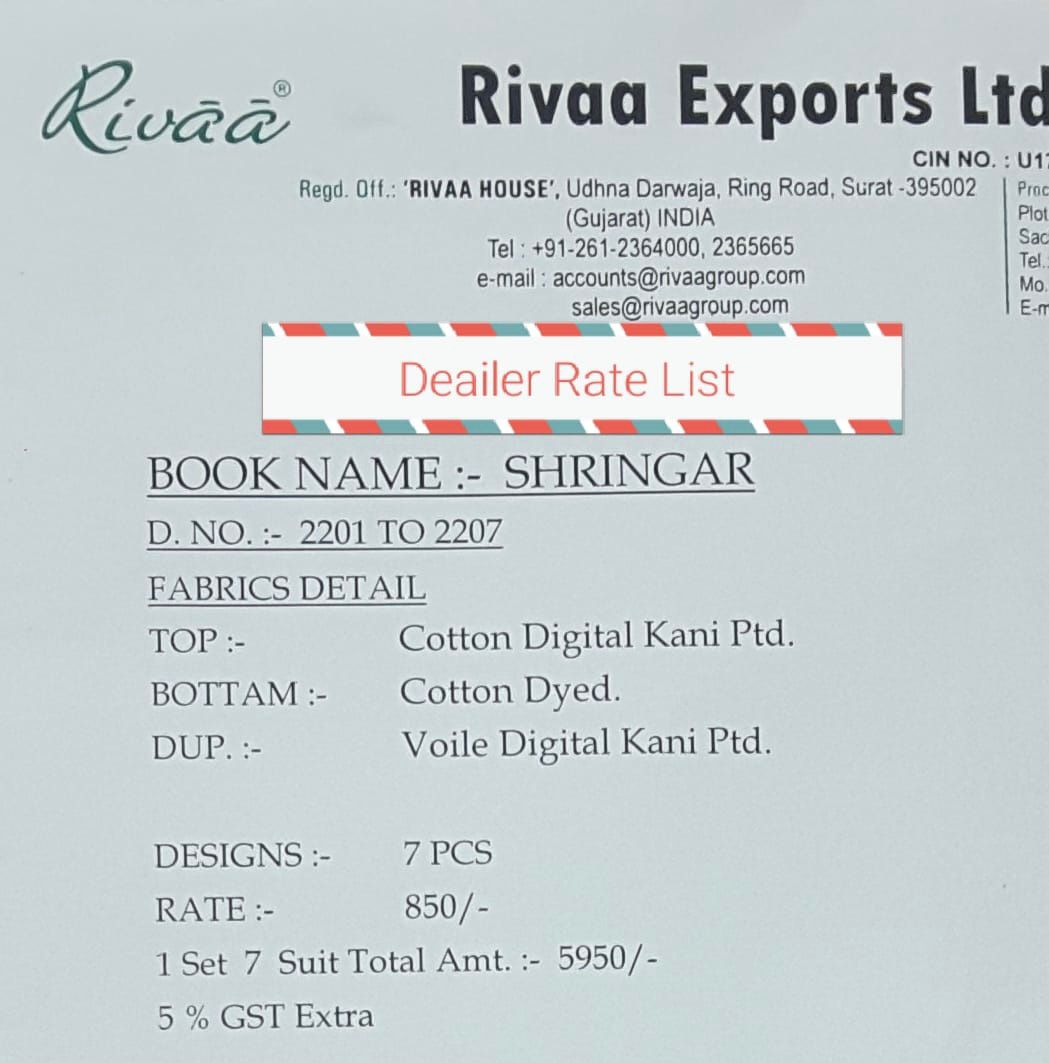 Buy Online Shringar By Rivaa Digital Cotton Suit Wholesale Supplier Traders In Surat 7 Pcs of Full Catalogue at Wholesale Price. Looking for Shringar By Rivaa Digital Cotton Suit Wholesale Supplier Traders In Surat Full Catalouge at Best Price? Buy Now Shringar By Rivaa Digital Cotton Suit Wholesale Supplier Traders In Surat at Wholesale Rate of Rs 5950 with Total 7 Pcs from authroized dealer and supplier of RIVAA Brand. Cost of Each piece is just only Rs 850 which is very low and affordable price to resale the product in your retail store ,This is Surat based Wholesale Supplier & Dealer of RIVAA Brand. Click on Brand name to Know more about RIVAA Brand's products.Call or Whatsapp on 9898838984 for booking or enquiry