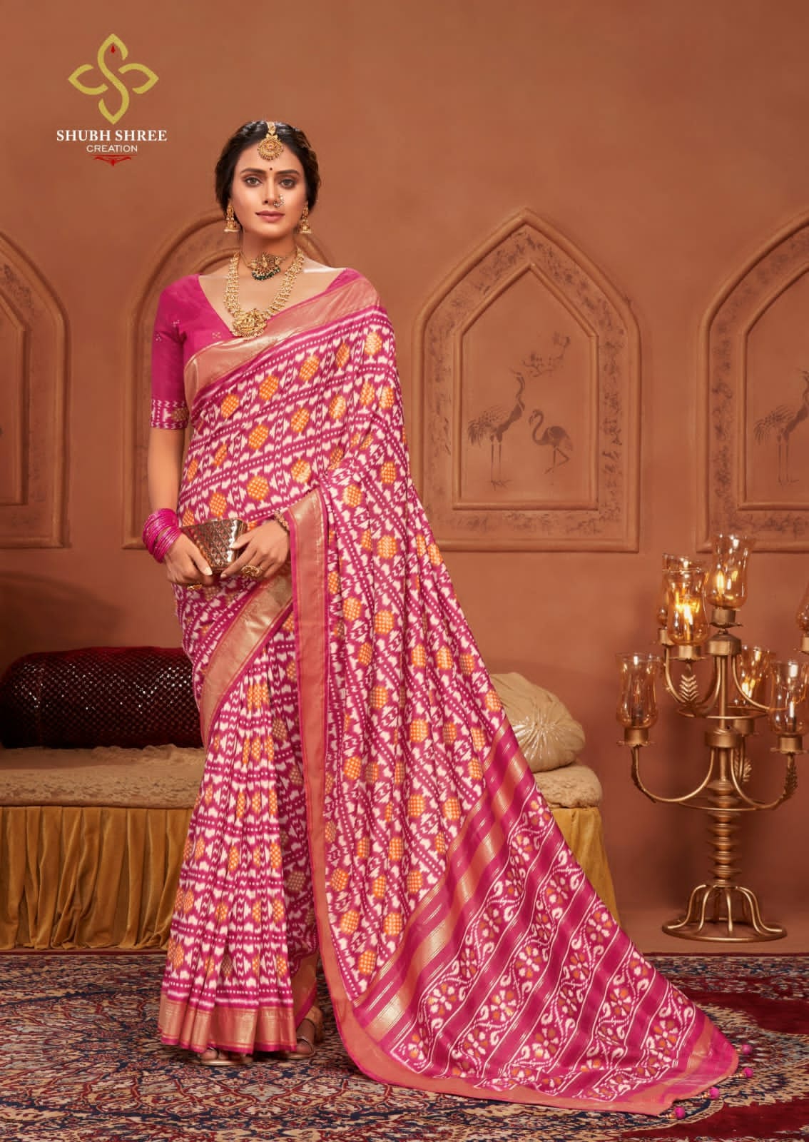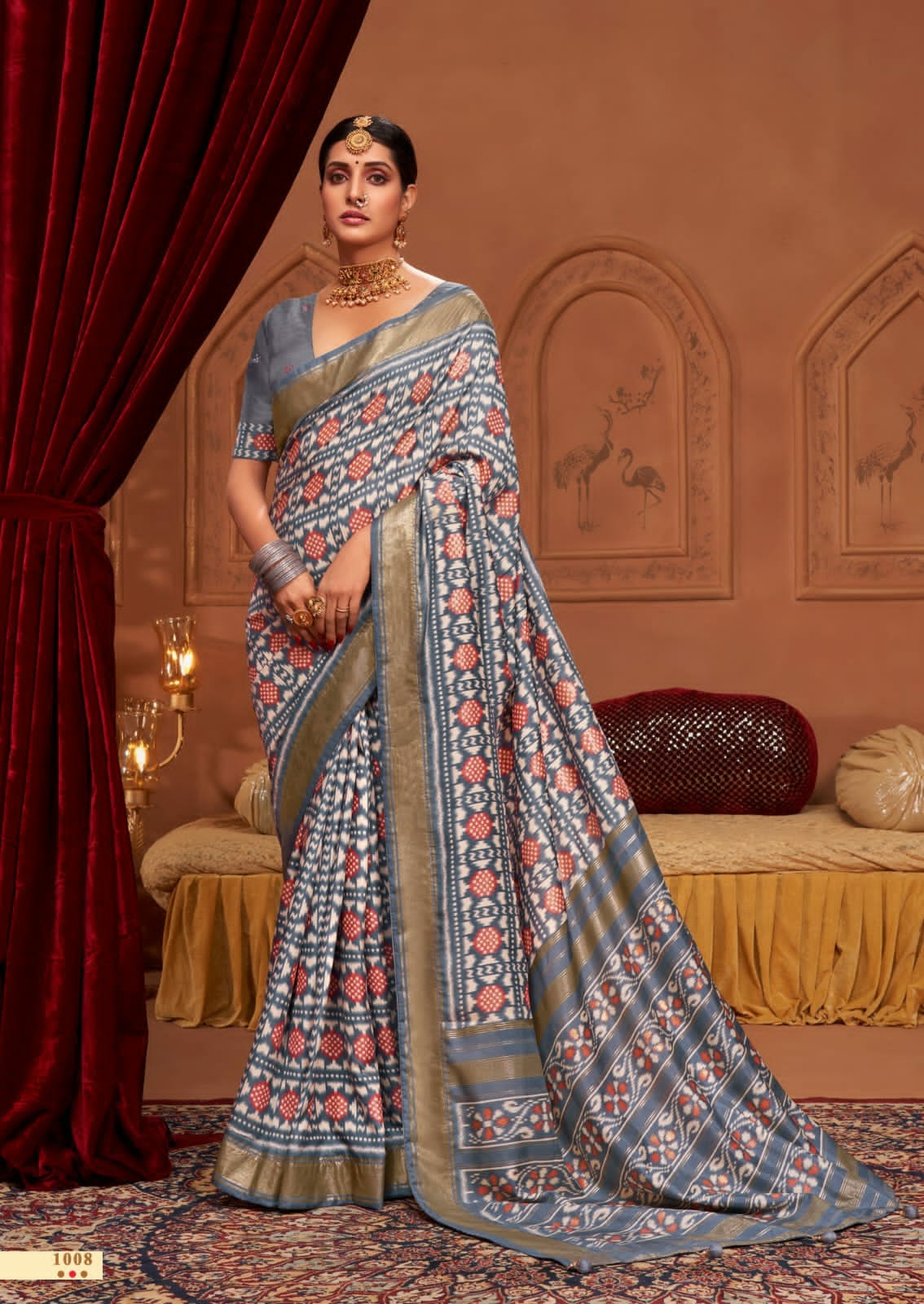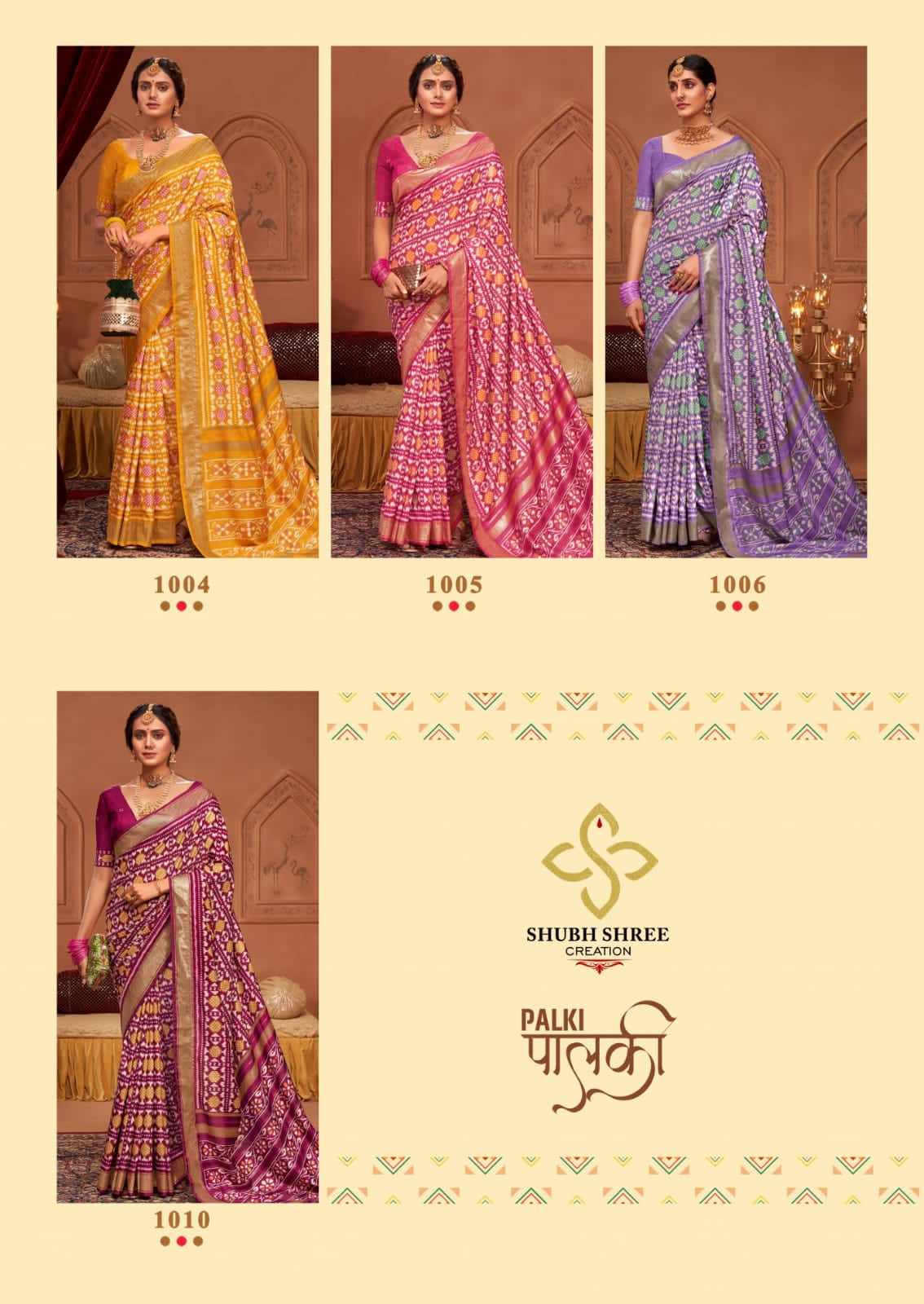(SHUBH SHREE CREATION) *CATALOGUE NAME:-* PALKI *CATALOGUE DETAILS:-* ??10;PCS CATALOGUE ??Singal DESIGN Ten COLOUR *FABRIC DETAILS:-* Welvet tussar silk with Picofol boder ?? *RATE:-845/-* GST EXTRA *single available* 100+single |