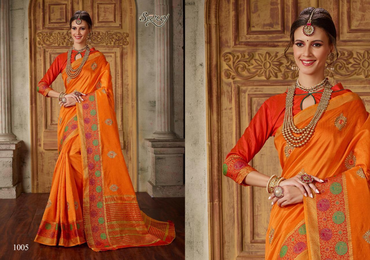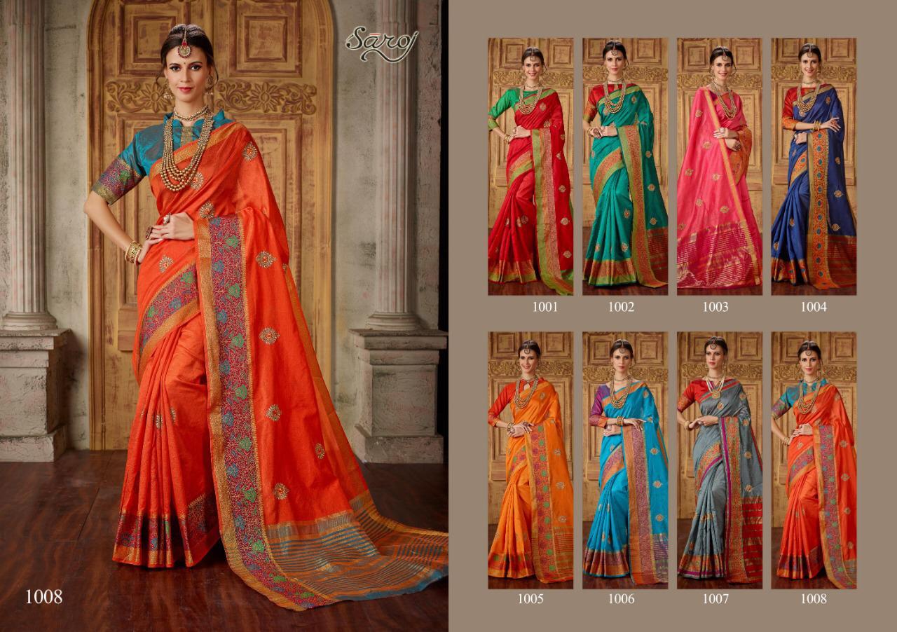 *Shubhmuhrat by Saroj * Rate -715 per pcs . Set to set . GST 5 Percent Extra. Delivery 3-4 days Fabric: Cotton Silk with embroidery work butti. Blouse: Banglori Silk. 8 Designs In set. Set to set . |