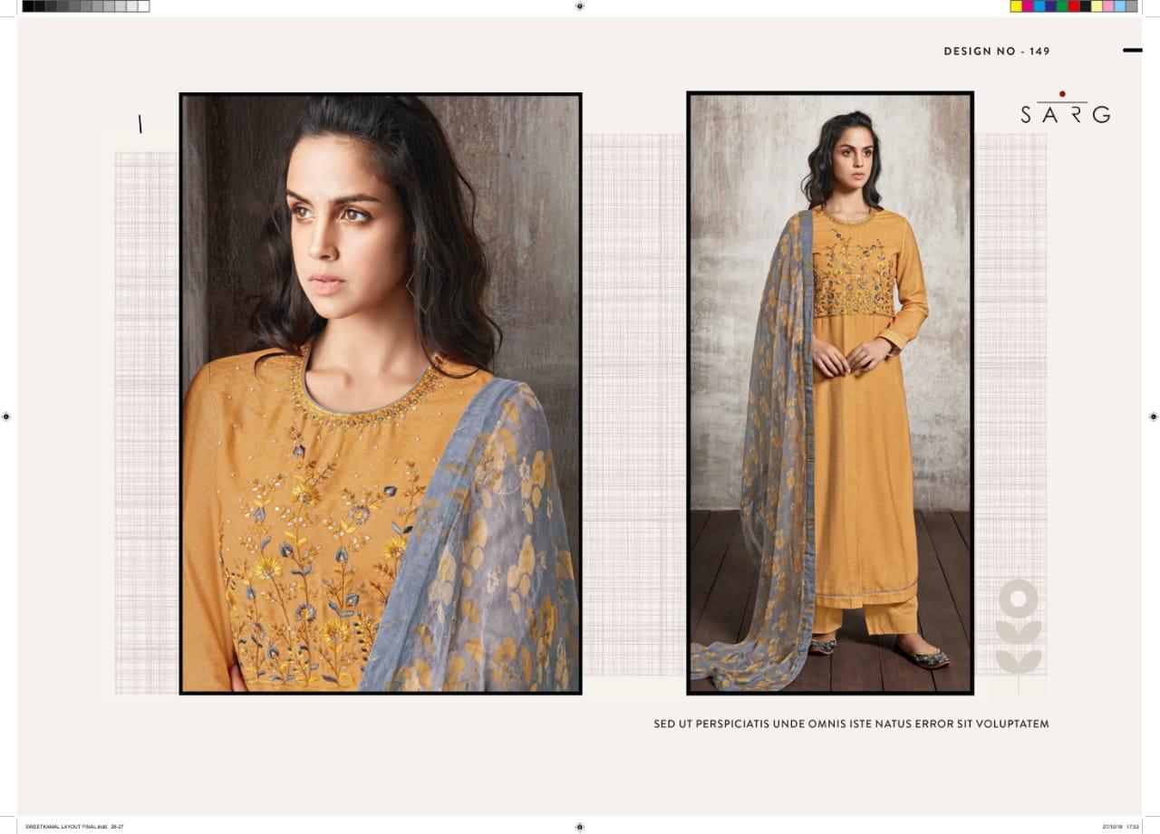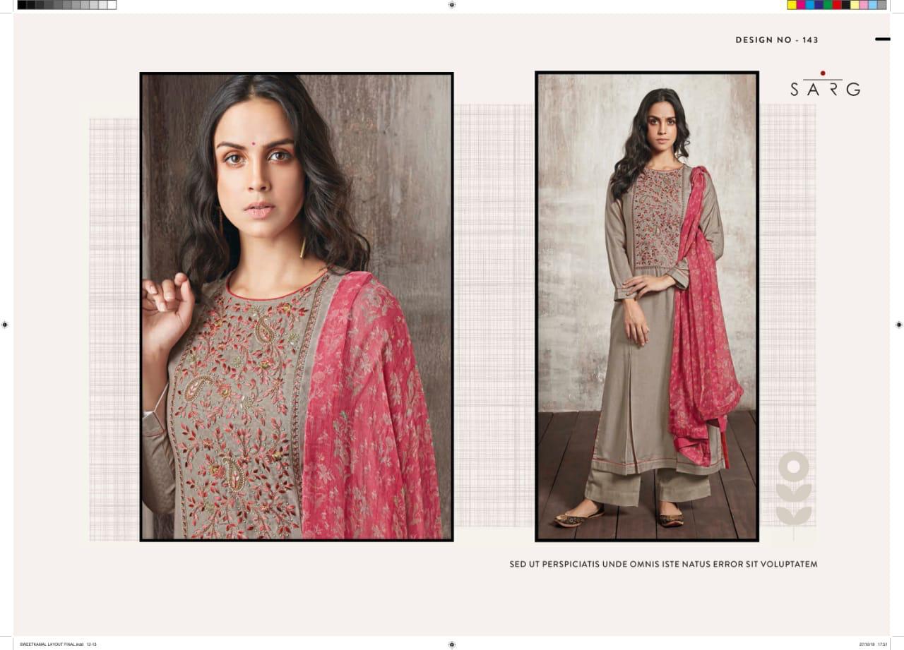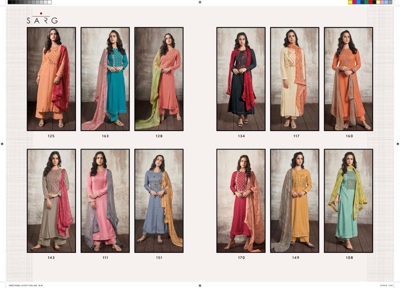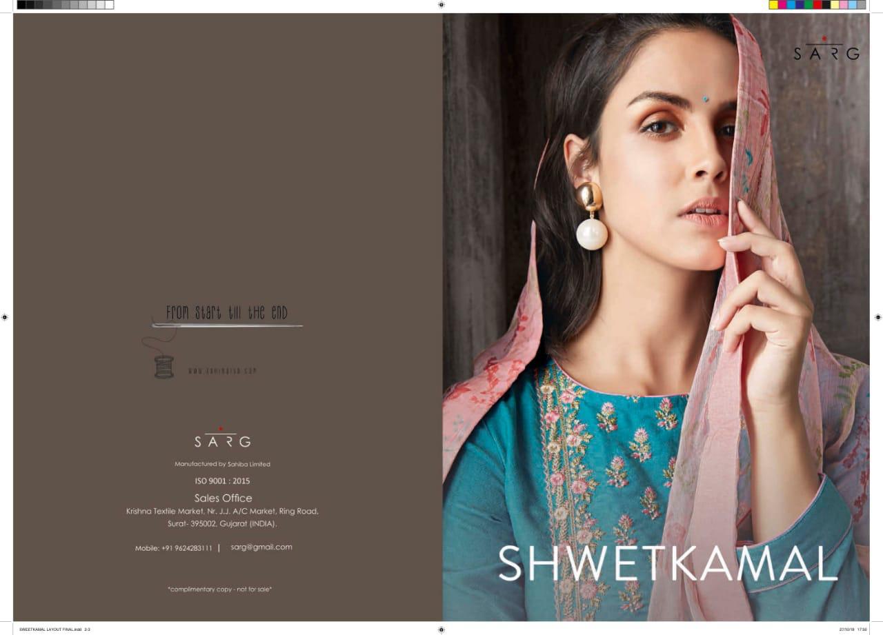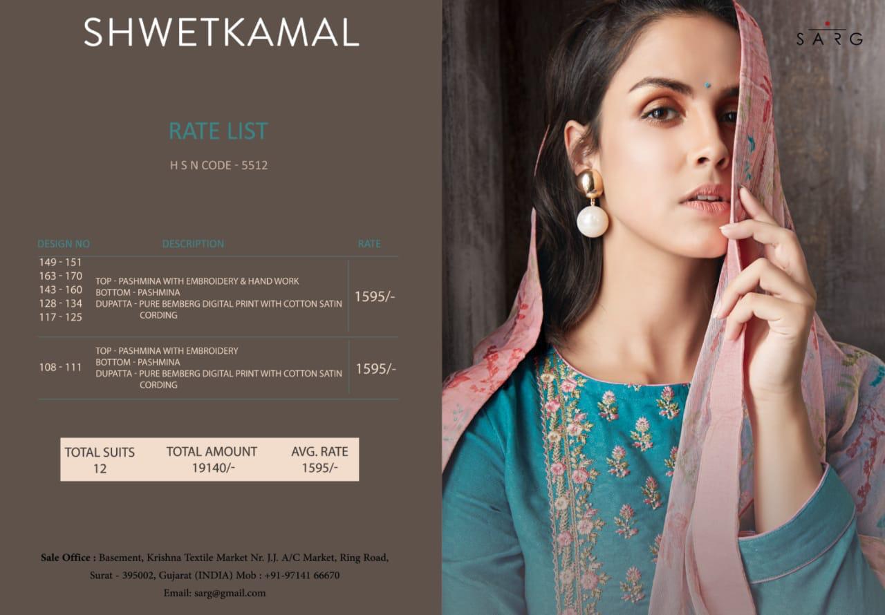 Buy Online Shwetkamal By Sarg 125 Series Fancy Pashmina Embroidery Salwar Kameez Catlog Wholesale Dealer Surat 12 Pcs of Full Catalogue at Wholesale Price. Looking for Shwetkamal By Sarg 125 Series Fancy Pashmina Embroidery Salwar Kameez Catlog Wholesale Dealer Surat Full Catalouge at Best Price? Buy Now Shwetkamal By Sarg 125 Series Fancy Pashmina Embroidery Salwar Kameez Catlog Wholesale Dealer Surat at Wholesale Rate of Rs 19140 with Total 12 Pcs from authroized dealer and supplier of SARG Brand. Cost of Each piece is just only Rs 1595 which is very low and affordable price to resale the product in your retail store ,This is Surat based Wholesale Supplier & Dealer of SARG Brand. Click on Brand name to Know more about SARG Brand's products.Call or Whatsapp on 9898838984 for booking or enquiry
