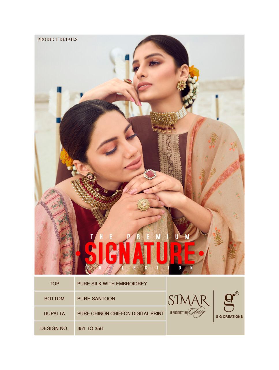Buy Online Signature By Glossy Series 351 To 356 Designer Party Wear Suits Wholesale Supplier Gujarat 6 Pcs of Full Catalogue at Wholesale Price. Looking for Signature By Glossy Series 351 To 356 Designer Party Wear Suits Wholesale Supplier Gujarat Full Catalouge at Best Price? Buy Now Signature By Glossy Series 351 To 356 Designer Party Wear Suits Wholesale Supplier Gujarat at Wholesale Rate of Rs 11370 with Total 6 Pcs from authroized dealer and supplier of GLOSSY Brand. Cost of Each piece is just only Rs 1895 which is very low and affordable price to resale the product in your retail store ,This is Surat based Wholesale Supplier & Dealer of GLOSSY Brand. Click on Brand name to Know more about GLOSSY Brand's products.Call or Whatsapp on 9898838984 for booking or enquiry