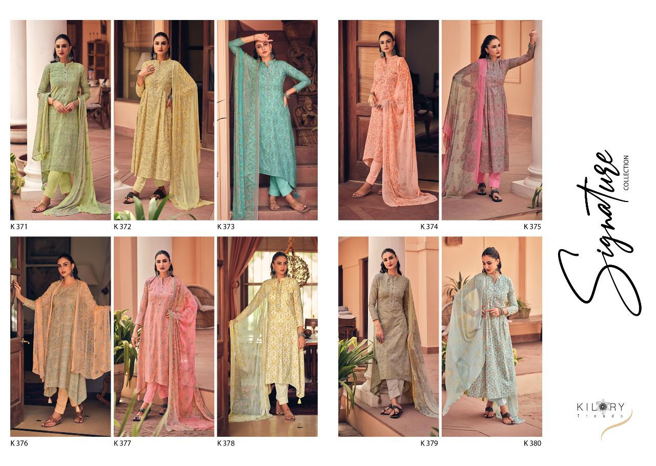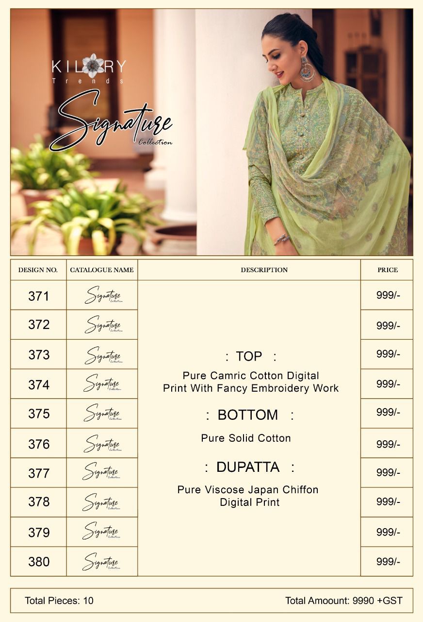 Buy Online Signature By Kilory Trendz Designer Suits Dealer And Exporter Surat Gujarat 10 Pcs of Full Catalogue at Wholesale Price. Looking for Signature By Kilory Trendz Designer Suits Dealer And Exporter Surat Gujarat Full Catalouge at Best Price? Buy Now Signature By Kilory Trendz Designer Suits Dealer And Exporter Surat Gujarat at Wholesale Rate of Rs 9990 with Total 10 Pcs from authroized dealer and supplier of Brand. Cost of Each piece is just only Rs 999 which is very low and affordable price to resale the product in your retail store ,This is Surat based Wholesale Supplier & Dealer of Brand. Click on Brand name to Know more about Brand's products.Call or Whatsapp on 9898838984 for booking or enquiry