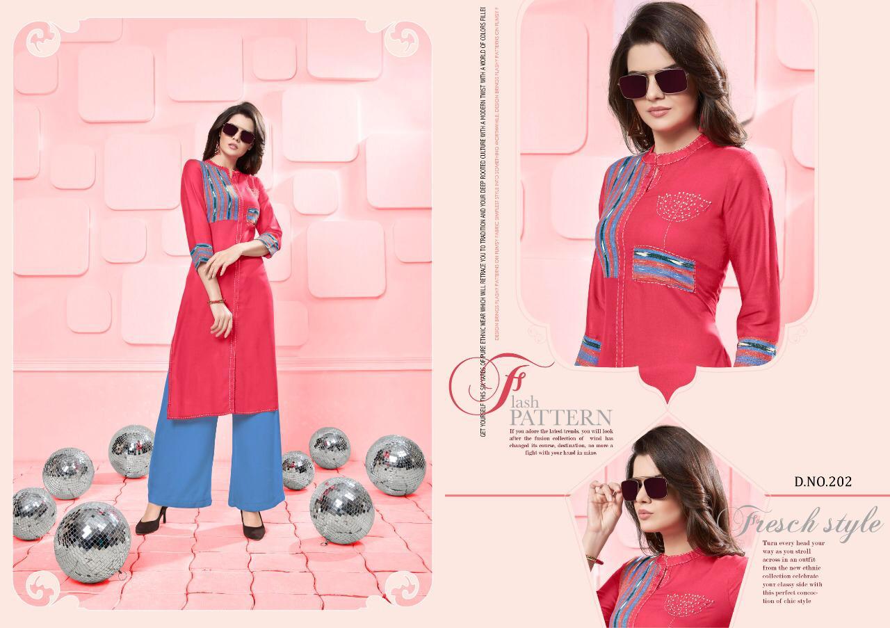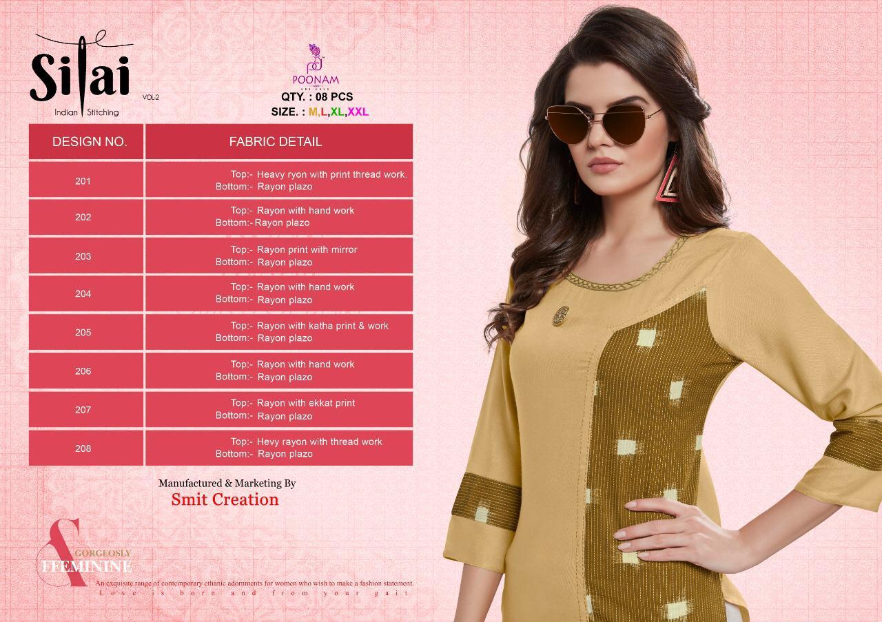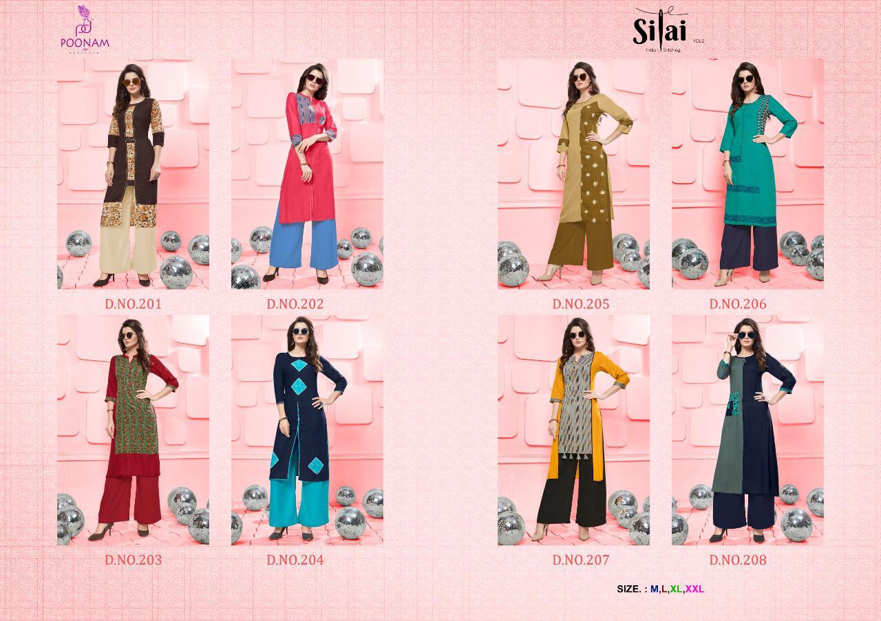 Buy Online Silai Vol 2 By Poonam Designer 201 Series Fancy Reyon Kurti With Plazzo Collection Wholesale Dealer Surat 8 Pcs of Full Catalogue at Wholesale Price. Looking for Silai Vol 2 By Poonam Designer 201 Series Fancy Reyon Kurti With Plazzo Collection Wholesale Dealer Surat Full Catalouge at Best Price? Buy Now Silai Vol 2 By Poonam Designer 201 Series Fancy Reyon Kurti With Plazzo Collection Wholesale Dealer Surat at Wholesale Rate of Rs 4680 with Total 8 Pcs from authroized dealer and supplier of Poonam designer Brand. Cost of Each piece is just only Rs 585 which is very low and affordable price to resale the product in your retail store ,This is Surat based Wholesale Supplier & Dealer of Poonam designer Brand. Click on Brand name to Know more about Poonam designer Brand's products.Call or Whatsapp on 9898838984 for booking or enquiry