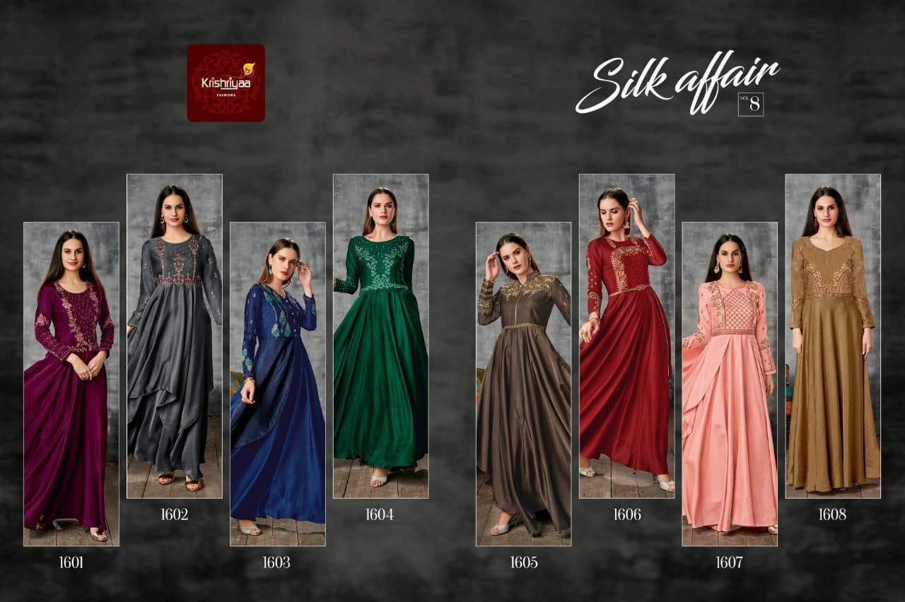 Buy Online Silk Affair Vol 8 By Krishriyaa Silk Slub Kurtis Wholesale Supplier Gujarat 8 Pcs of Full Catalogue at Wholesale Price. Looking for Silk Affair Vol 8 By Krishriyaa Silk Slub Kurtis Wholesale Supplier Gujarat Full Catalouge at Best Price? Buy Now Silk Affair Vol 8 By Krishriyaa Silk Slub Kurtis Wholesale Supplier Gujarat at Wholesale Rate of Rs 8360 with Total 8 Pcs from authroized dealer and supplier of KRISHRYAA Brand. Cost of Each piece is just only Rs 1045 which is very low and affordable price to resale the product in your retail store ,This is Surat based Wholesale Supplier & Dealer of KRISHRYAA Brand. Click on Brand name to Know more about KRISHRYAA Brand's products.Call or Whatsapp on 9898838984 for booking or enquiry