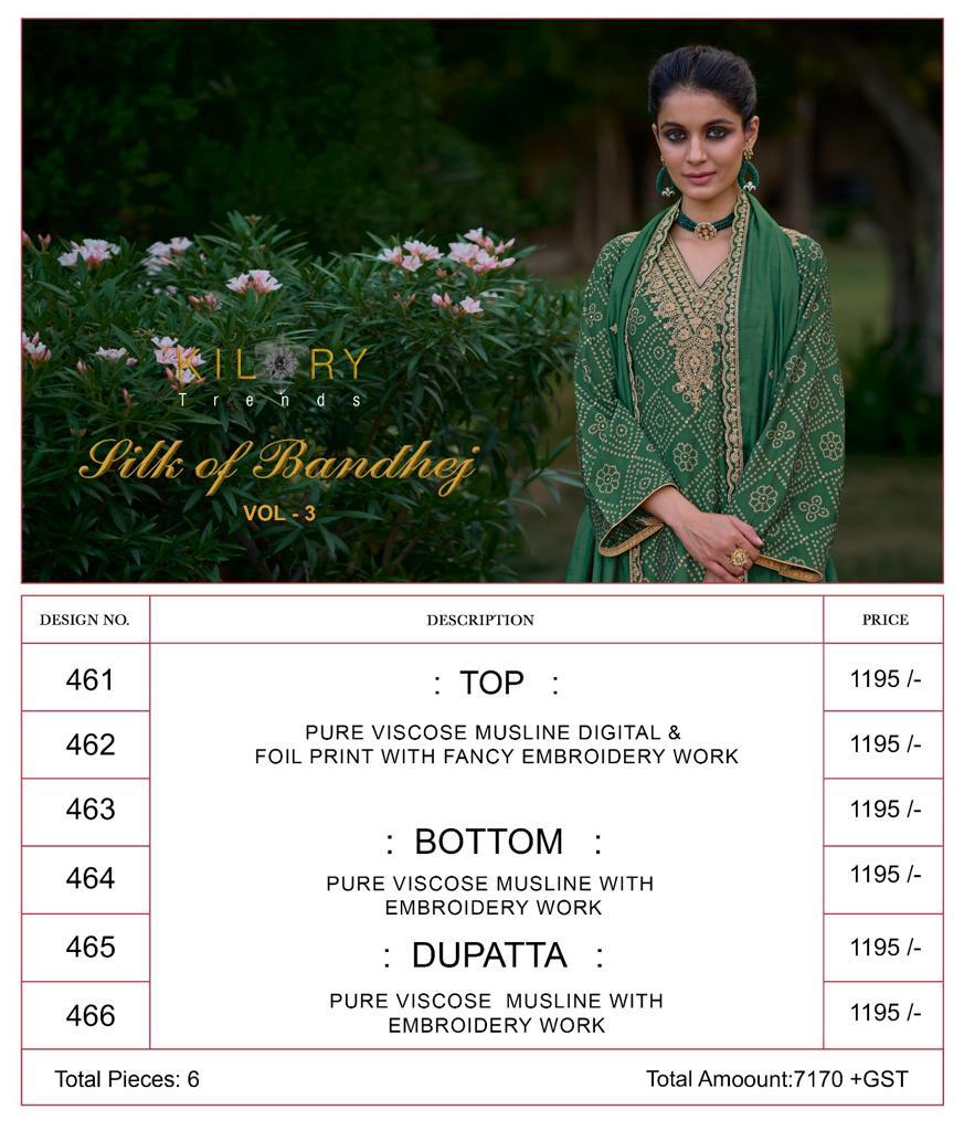 Buy Online Silk Of Bandhej Vol 3 Kilory Trandz 6 Pcs of Full Catalogue at Wholesale Price. Looking for Silk Of Bandhej Vol 3 Kilory Trandz Full Catalouge at Best Price? Buy Now Silk Of Bandhej Vol 3 Kilory Trandz at Wholesale Rate of Rs 7170 with Total 6 Pcs from authroized dealer and supplier of Brand. Cost of Each piece is just only Rs 1195 which is very low and affordable price to resale the product in your retail store ,This is Surat based Wholesale Supplier & Dealer of Brand. Click on Brand name to Know more about Brand's products.Call or Whatsapp on 9898838984 for booking or enquiry