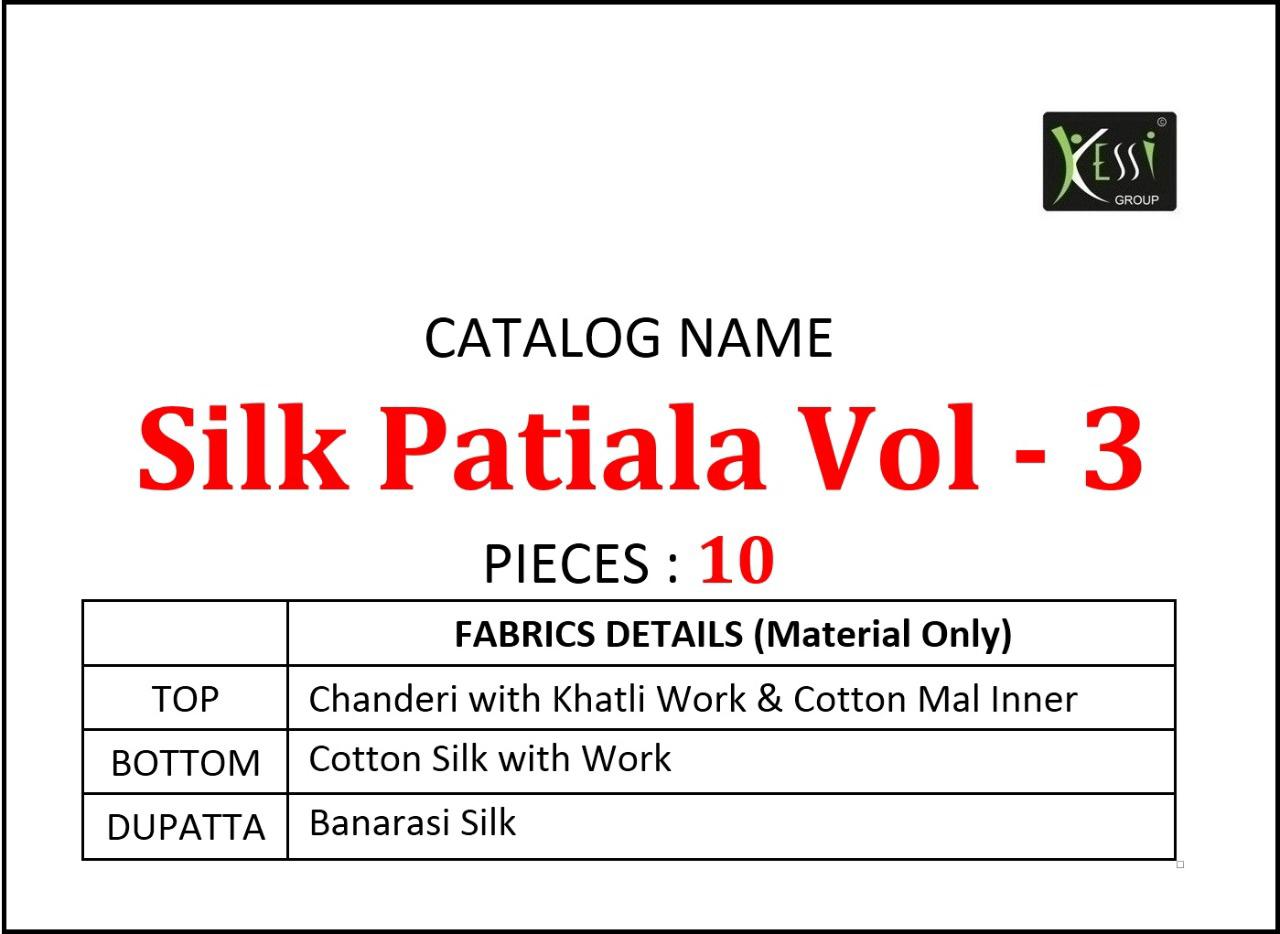 Buy Online Silk Patiala Vol 3 By Kessi Cotton Silk Dress Materials Wholesale Dealer Surat 10 Pcs of Full Catalogue at Wholesale Price. Looking for Silk Patiala Vol 3 By Kessi Cotton Silk Dress Materials Wholesale Dealer Surat Full Catalouge at Best Price? Buy Now Silk Patiala Vol 3 By Kessi Cotton Silk Dress Materials Wholesale Dealer Surat at Wholesale Rate of Rs 8990 with Total 10 Pcs from authroized dealer and supplier of KESSI Brand. Cost of Each piece is just only Rs 899 which is very low and affordable price to resale the product in your retail store ,This is Surat based Wholesale Supplier & Dealer of KESSI Brand. Click on Brand name to Know more about KESSI Brand's products.Call or Whatsapp on 9898838984 for booking or enquiry