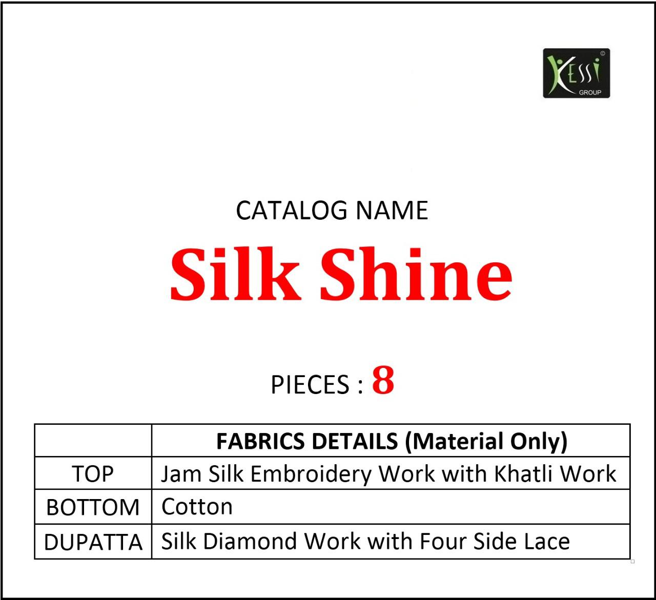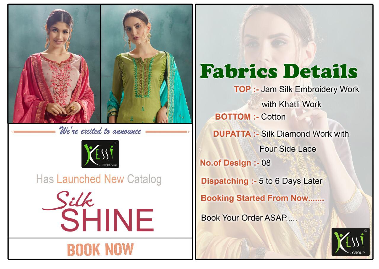 ? *Kessi Fabrics Pvt. Ltd.* has launched _Catalog name_ : *Silk Shine* ? _Fabric Details_ ? ?Top:- Jam Satin Embroidery Work with Khatli Work ?Bottom:- Cotton ?Dupatta:- Silk Diamond Work with Four Side Less ?Total Design:- 8 Rate - 899 per Pcs Set To Set . GST 5 Percent Extra ?Dispatching 5 to 6 days later ?Booking started from now... ?Order yours soon.... |