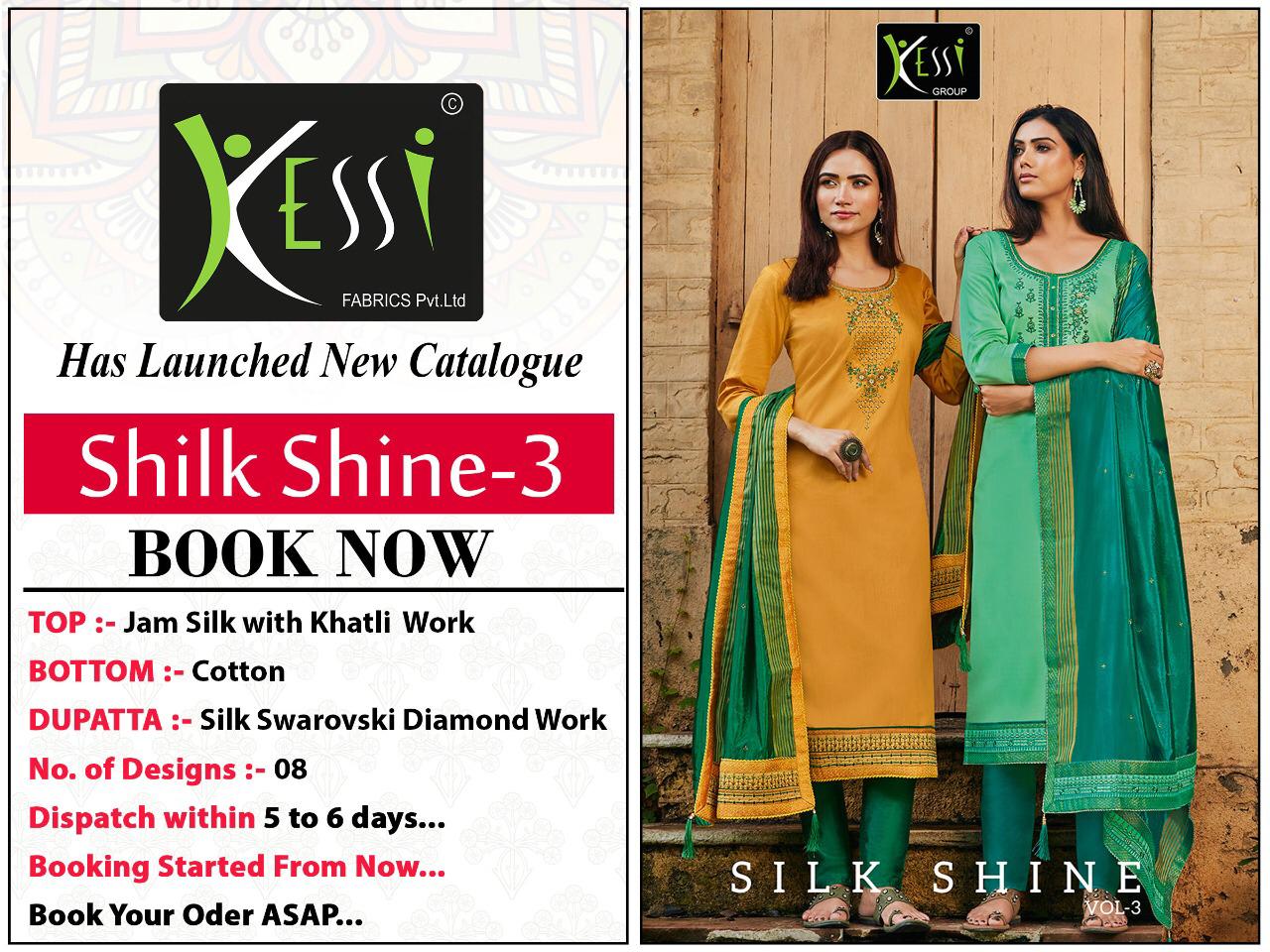Buy Online Silk Shine Vol 3 By Kessi Designer Party Wear Suits Wholesale Supplier Gujarat 8 Pcs of Full Catalogue at Wholesale Price. Looking for Silk Shine Vol 3 By Kessi Designer Party Wear Suits Wholesale Supplier Gujarat Full Catalouge at Best Price? Buy Now Silk Shine Vol 3 By Kessi Designer Party Wear Suits Wholesale Supplier Gujarat at Wholesale Rate of Rs 7192 with Total 8 Pcs from authroized dealer and supplier of KESSI Brand. Cost of Each piece is just only Rs 899 which is very low and affordable price to resale the product in your retail store ,This is Surat based Wholesale Supplier & Dealer of KESSI Brand. Click on Brand name to Know more about KESSI Brand's products.Call or Whatsapp on 9898838984 for booking or enquiry