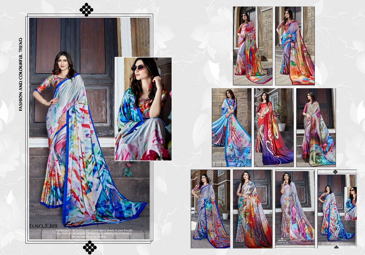 Buy Online Silk Villa Paris Silk 5301 Series Satin Crepe Digital Saree 9 Pcs of Full Catalogue at Wholesale Price. Looking for Silk Villa Paris Silk 5301 Series Satin Crepe Digital Saree Full Catalouge at Best Price? Buy Now Silk Villa Paris Silk 5301 Series Satin Crepe Digital Saree at Wholesale Rate of Rs 9765 with Total 9 Pcs from authroized dealer and supplier of SILK VILLA Brand. Cost of Each piece is just only Rs 1085 which is very low and affordable price to resale the product in your retail store ,This is Surat based Wholesale Supplier & Dealer of SILK VILLA Brand. Click on Brand name to Know more about SILK VILLA Brand's products.Call or Whatsapp on 9898838984 for booking or enquiry