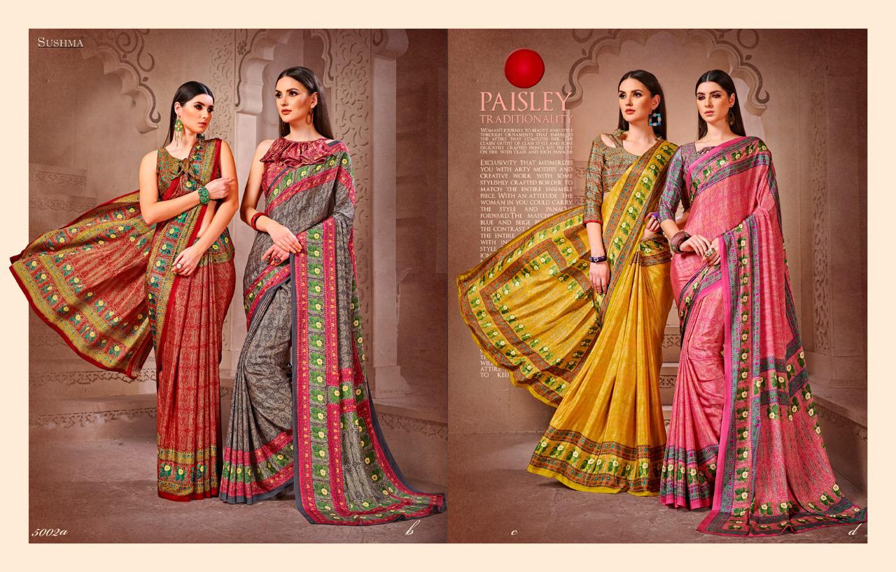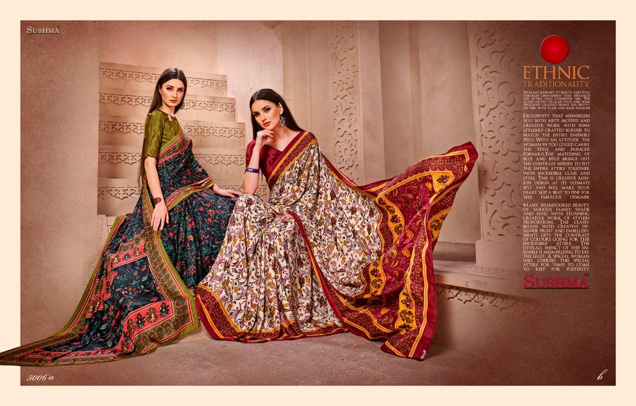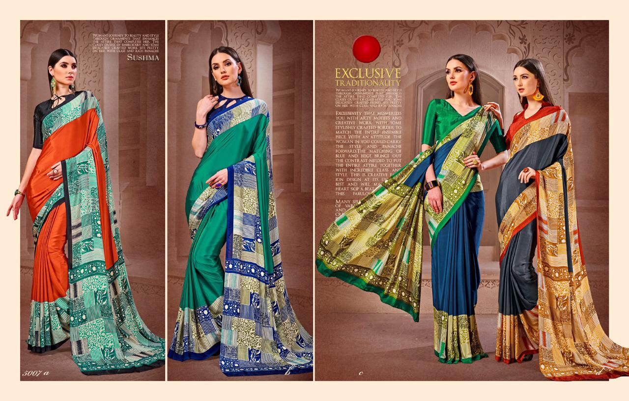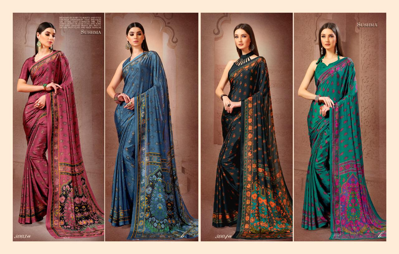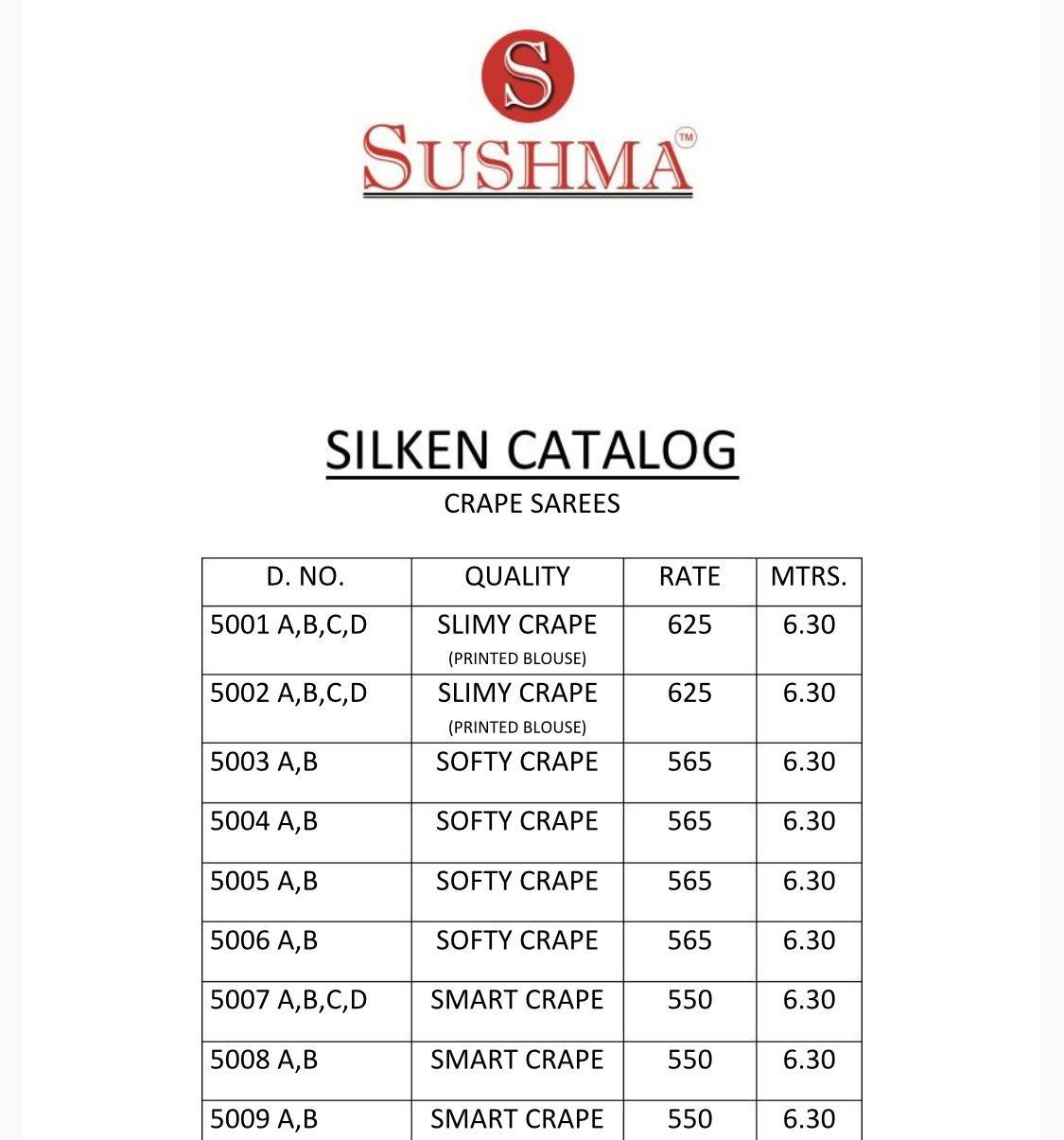 Buy Online Silken By Sushama Series 5001a Crape Printed Sarees Wholesale Supplier And Dealer Gujarat 24 Pcs of Full Catalogue at Wholesale Price. Looking for Silken By Sushama Series 5001a Crape Printed Sarees Wholesale Supplier And Dealer Gujarat Full Catalouge at Best Price? Buy Now Silken By Sushama Series 5001a Crape Printed Sarees Wholesale Supplier And Dealer Gujarat at Wholesale Rate of Rs 13920 with Total 24 Pcs from authroized dealer and supplier of SUSHMA Brand. Cost of Each piece is just only Rs 580 which is very low and affordable price to resale the product in your retail store ,This is Surat based Wholesale Supplier & Dealer of SUSHMA Brand. Click on Brand name to Know more about SUSHMA Brand's products.Call or Whatsapp on 9898838984 for booking or enquiry