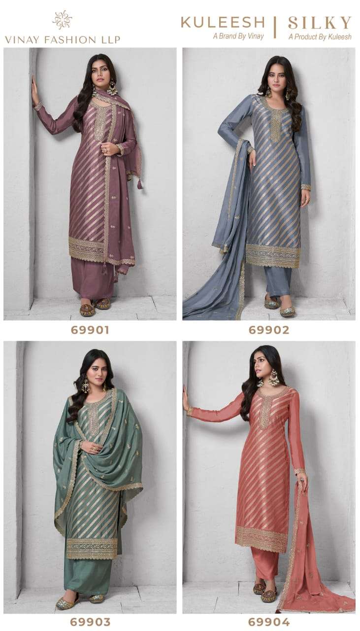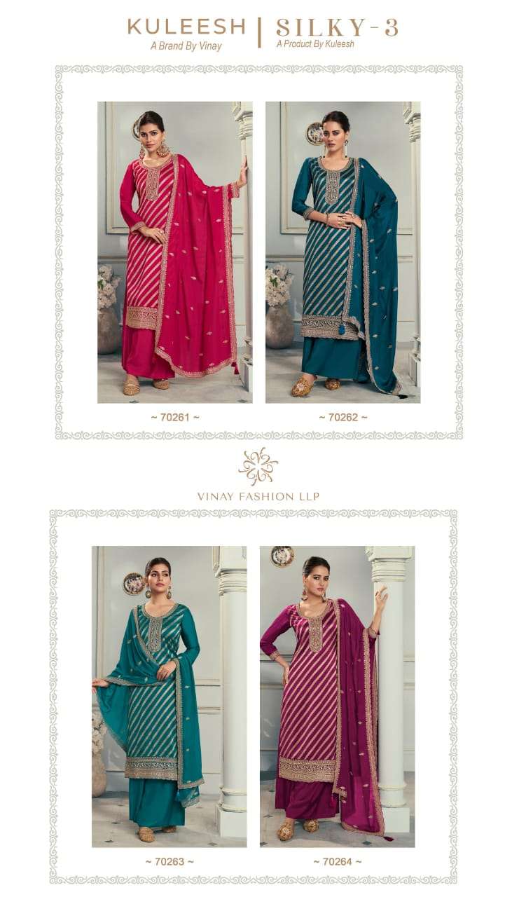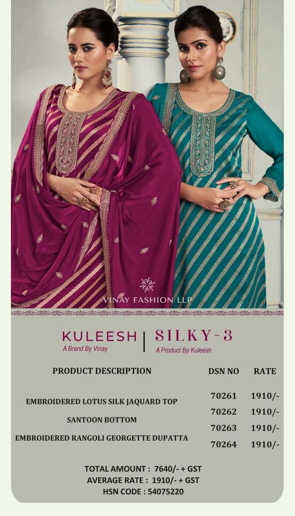 Buy Online SILKY 3 LIGHT DARK by vinay fashion JACQUARD silk suit collection manufacturer surat 4 Pcs of Full Catalogue at Wholesale Price. Looking for SILKY 3 LIGHT DARK by vinay fashion JACQUARD silk suit collection manufacturer surat Full Catalouge at Best Price? Buy Now SILKY 3 LIGHT DARK by vinay fashion JACQUARD silk suit collection manufacturer surat at Wholesale Rate of Rs 7640 with Total 4 Pcs from authroized dealer and supplier of Vinay Fashion Brand. Cost of Each piece is just only Rs 1910 which is very low and affordable price to resale the product in your retail store ,This is Surat based Wholesale Supplier & Dealer of Vinay Fashion Brand. Click on Brand name to Know more about Vinay Fashion Brand's products.Call or Whatsapp on 9898838984 for booking or enquiry